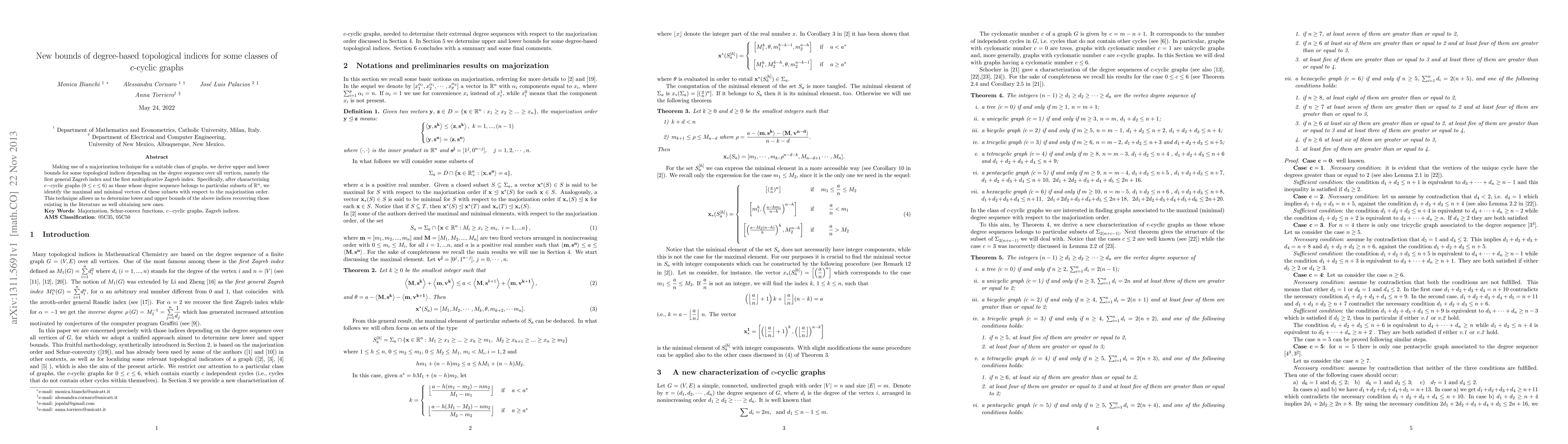 Making use of a majorization technique for a suitable class of graphs, we derive upper and lower bounds for some topological indices depending on the degree sequence over all vertices, namely the first general Zagreb index and the first multiplicative Zagreb index. Specifically, after characterizing $c-$cyclic graphs $(0\leq c\leq 6)$ as those whose degree sequence belongs to particular subsets of $\mathbb{R}^{n}$, we identify the maximal and minimal vectors of these subsets with respect to the majorization order. This technique allows us to determine lower and upper bounds of the above indices recovering those existing in the literature as well obtaining new ones.