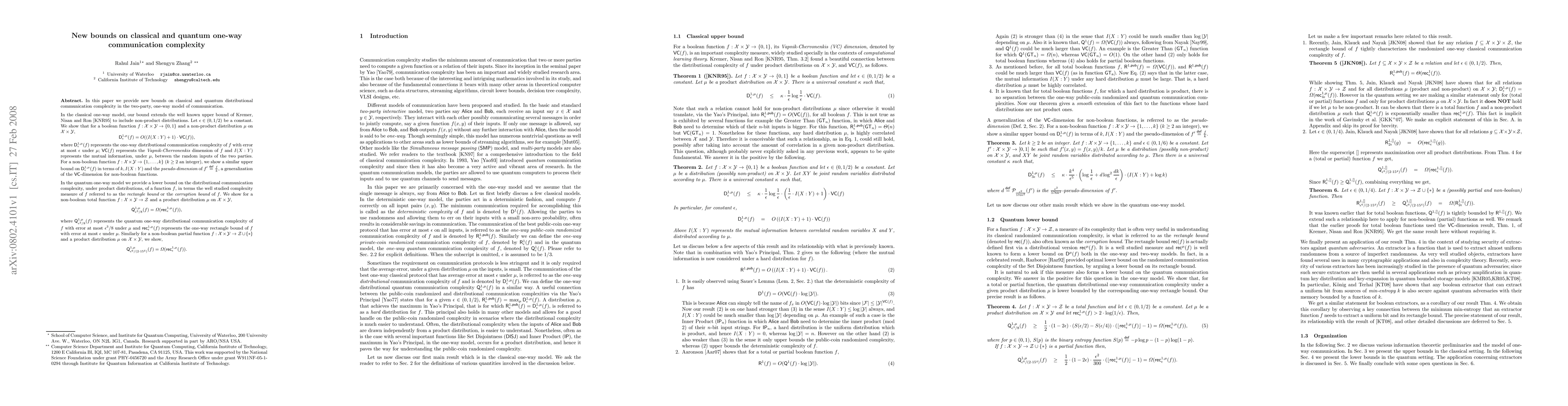 This paper establishes new bounds on classical and quantum one-way communication complexity. For classical communication, it extends existing upper bounds to non-product distributions, relating one-way distributional complexity to mutual information and VC dimension. For quantum communication, it provides a lower bound on quantum one-way distributional complexity in terms of the rectangle bound for both total and partial functions.