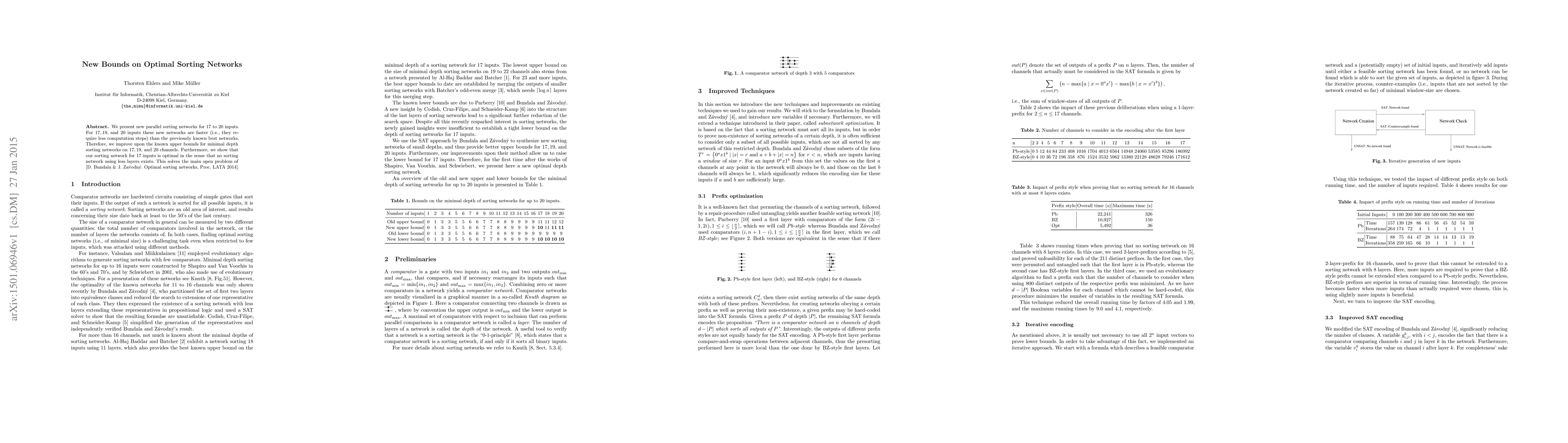 We present new parallel sorting networks for $17$ to $20$ inputs. For $17, 19,$ and $20$ inputs these new networks are faster (i.e., they require less computation steps) than the previously known best networks. Therefore, we improve upon the known upper bounds for minimal depth sorting networks on $17, 19,$ and $20$ channels. Furthermore, we show that our sorting network for $17$ inputs is optimal in the sense that no sorting network using less layers exists. This solves the main open problem of [D. Bundala & J. Za\'vodn\'y. Optimal sorting networks, Proc. LATA 2014].
