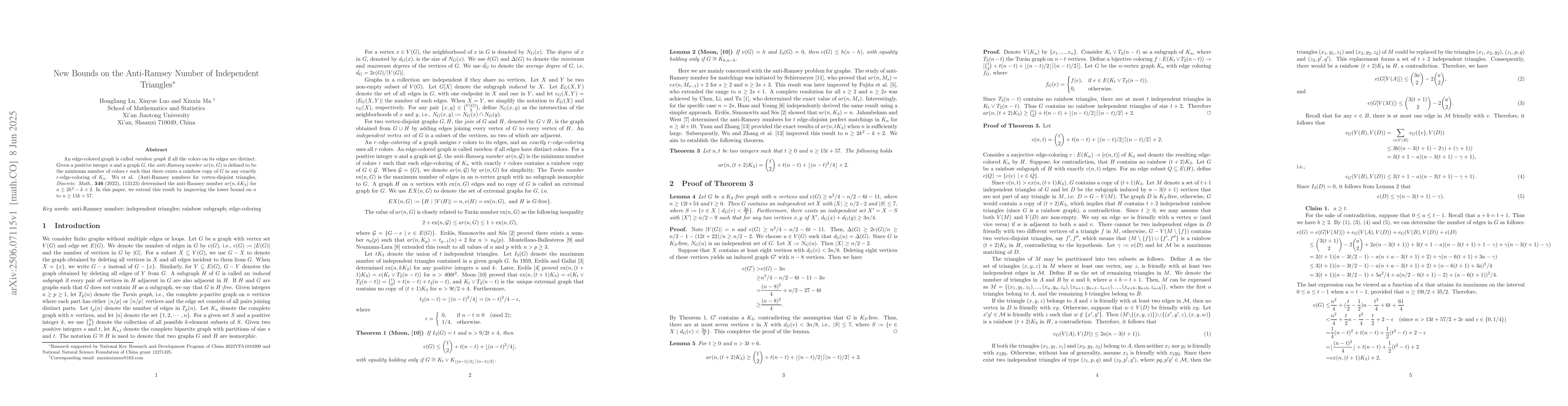 The research paper sets a new lower bound for the anti-Ramsey number of independent triangles in graph coloring, improving upon an existing result to $n eq 15k+57$. It improves our understanding of how many colors are needed to ensure a rainbow copy of an independent triangle exists in any coloring of the complete graph.