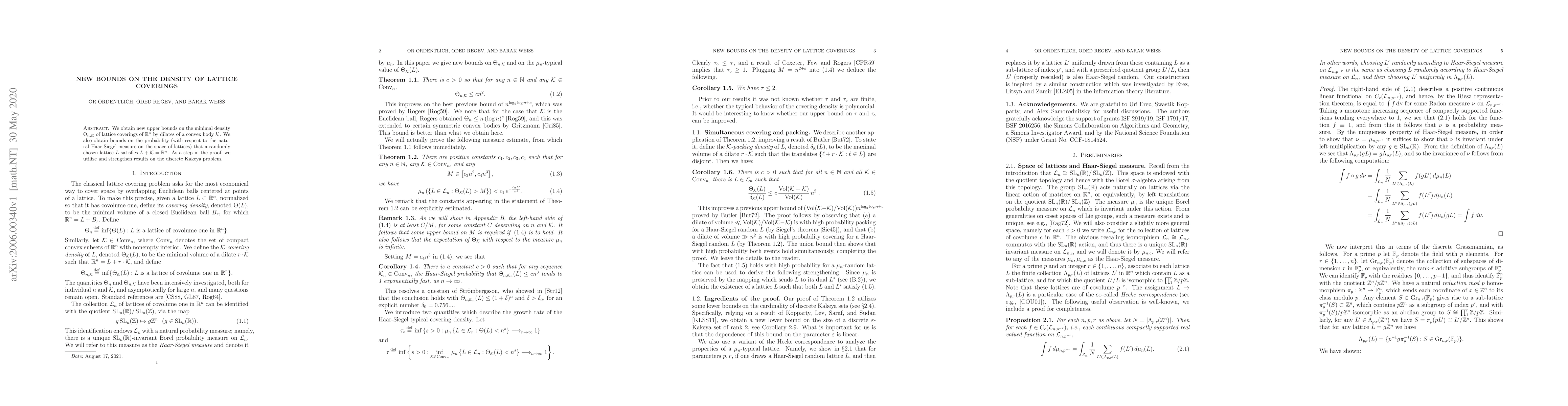 We obtain new upper bounds on the minimal density of lattice coverings of Euclidean space by dilates of a convex body K. We also obtain bounds on the probability (with respect to the natural Haar-Siegel measure on the space of lattices) that a randomly chosen lattice L satisfies that L+K is all of space. As a step in the proof, we utilize and strengthen results on the discrete Kakeya problem.