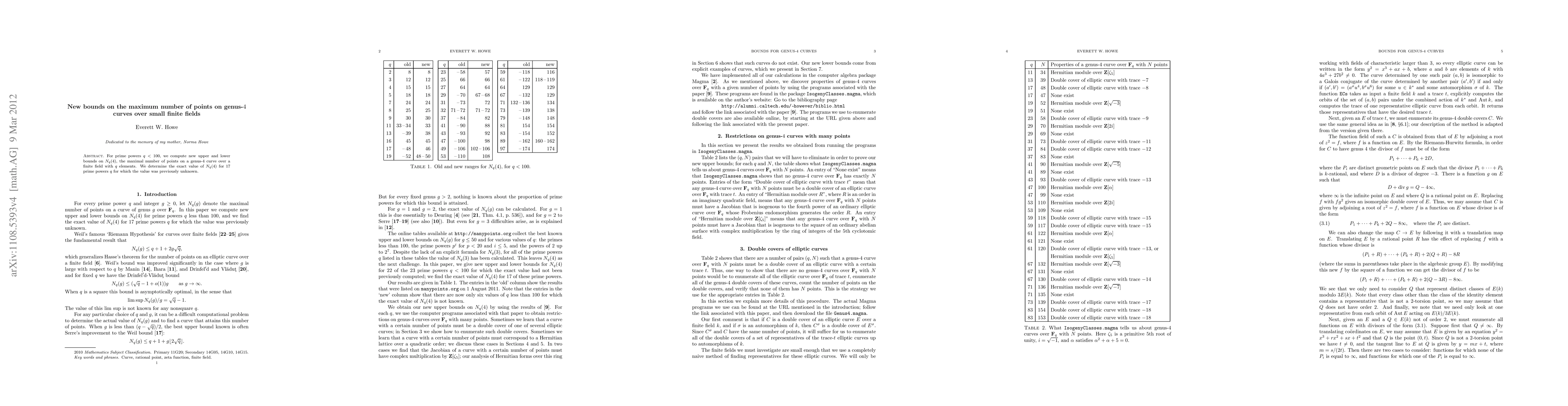 This paper provides new upper and lower bounds for the maximum number of points on genus-4 curves over finite fields with prime powers less than 100 elements. It also determines the exact value of N_q(4) for 17 previously unknown prime powers q.