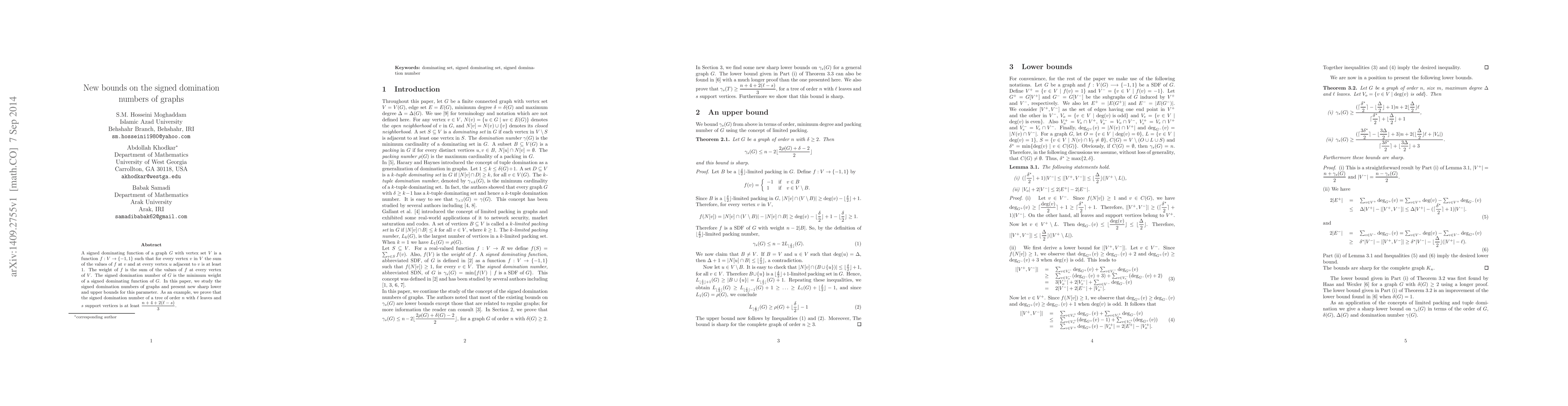 In this paper, we study the signed domination numbers of graphs and present new sharp lower and upper bounds for this parameter. As an example, we present a lower bound on signed domination number of trees in terms of the order, leaves and support vertices.