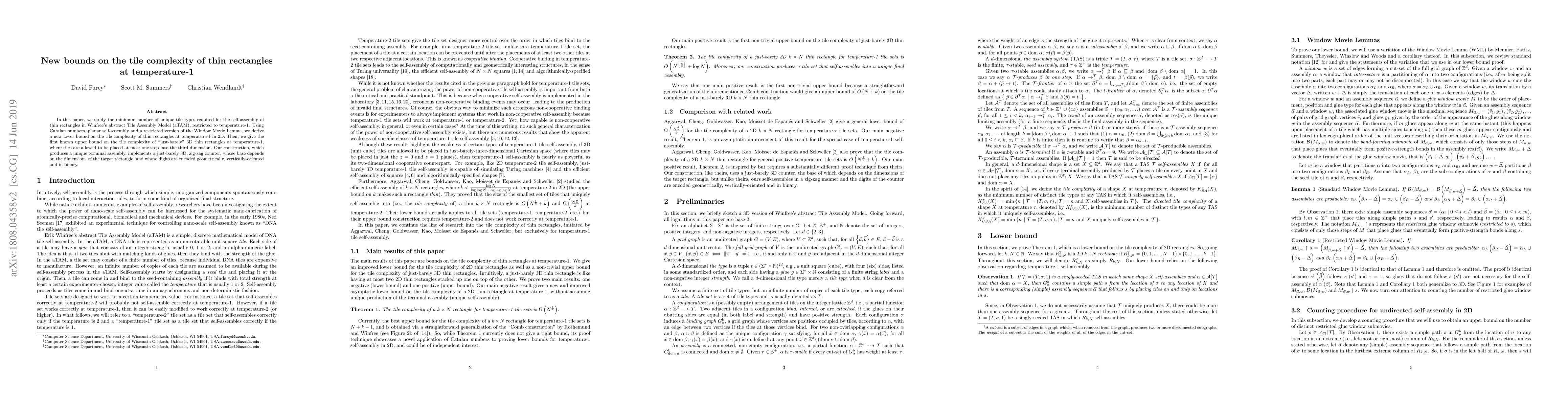 Researchers set new bounds for the minimum number of unique tile types needed to assemble thin rectangles in a specific mathematical model, improving our understanding of 2D and 3D self-assembly processes.