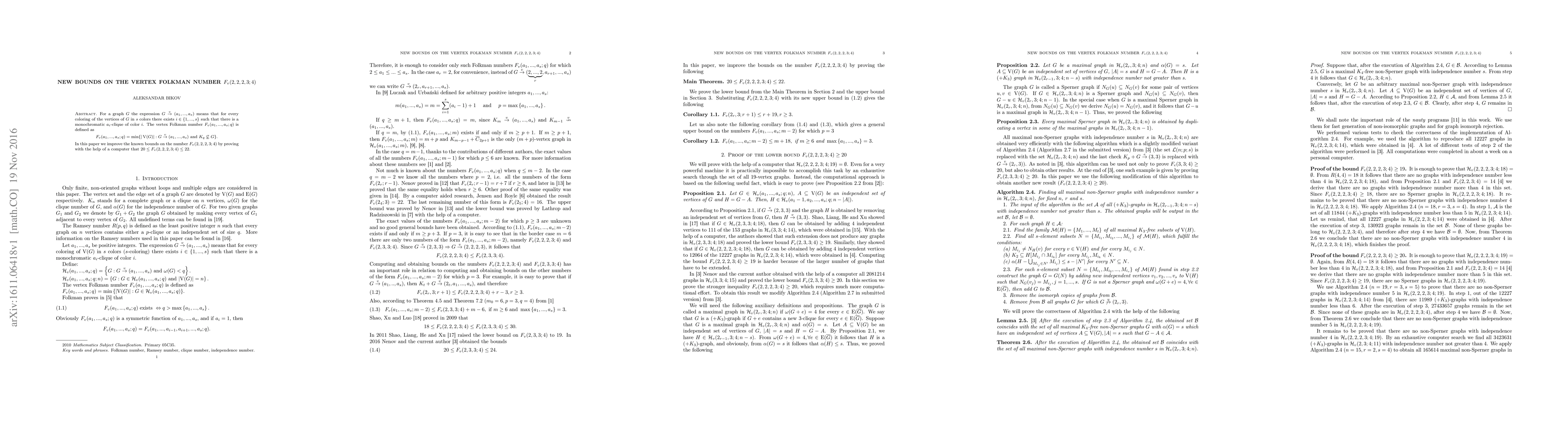 For a graph $G$ the expression $G \overset{v}{\rightarrow} (a_1, ..., a_s)$ means that for every coloring of the vertices of $G$ in $s$ colors there exists $i \in \{1, ..., s\}$ such that there is a monochromatic $a_i$-clique of color $i$. The vertex Folkman number $F_v(a_1, ..., a_s; q)$ is defined as $$F_v(a_1, ..., a_s; q) = \min\{\vert V(G) \vert : G \overset{v}{\rightarrow} (a_1, ..., a_s) \mbox{ and } K_q \not\subseteq G\}.$$ In this paper we improve the known bounds on the number $F_v(2, 2, 2, 3; 4)$ by proving with the help of a computer that $20 \leq F_v(2, 2, 2, 3; 4) \leq 22$.