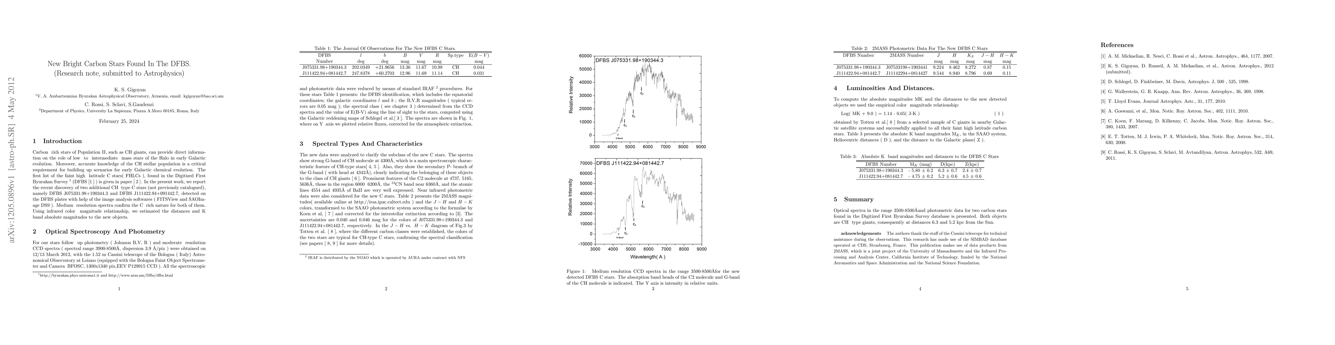 This research identifies two new Carbon-rich (CH) stars, DFBS J075331.98+190344.3 and DFBS J111422.94+091442.7, found using image analysis software on Digitized First Byurakan Survey plates. Spectroscopic confirmation of their C-rich nature and distance estimation via infrared color-magnitude relationships are presented.