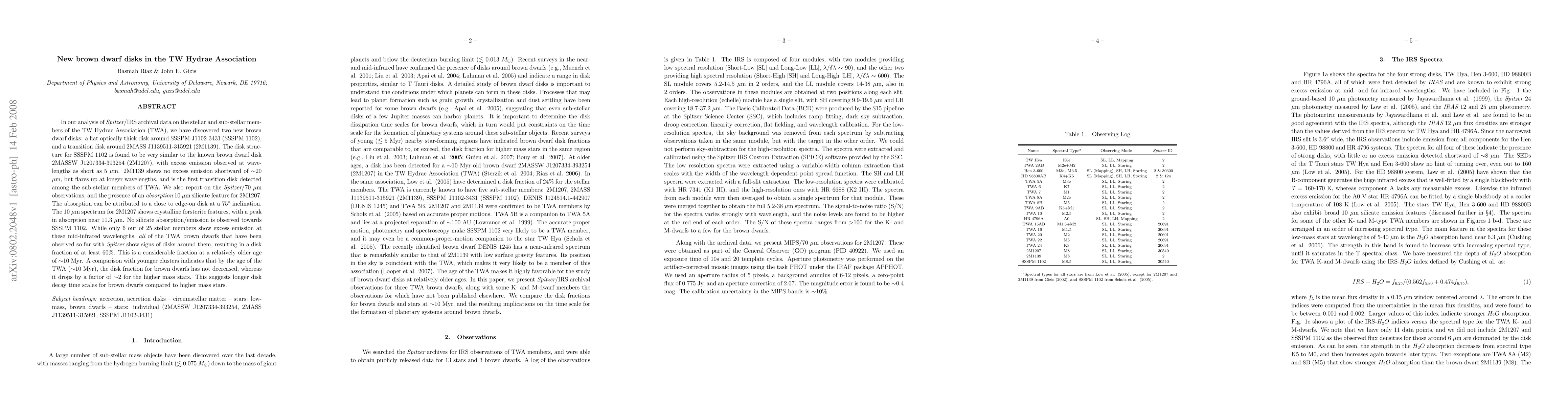 In our analysis of {\it Spitzer}/IRS archival data on the stellar and sub-stellar members of the TW Hydrae Association (TWA), we have discovered two new brown dwarf disks: a flat optically thick disk around SSSPM J1102-3431 (SSSPM 1102), and a transition disk around 2MASS J1139511-315921 (2M1139). The disk structure for SSSPM 1102 is found to be very similar to the known brown dwarf disk 2MASSW J1207334-393254 (2M1207), with excess emission observed at wavelengths as short as 5 $\micron$. 2M1139 shows no excess emission shortward of $\sim$20 $\micron$, but flares up at longer wavelengths, and is the first transition disk detected among the sub-stellar members of TWA. We also report on the {\it Spitzer}/70 $\micron$ observations, and the presence of a weak {\it absorption} 10 $\micron$ silicate feature for 2M1207. The absorption can be attributed to a close to edge-on disk at a 75$\degr$ inclination. The 10 $\micron$ spectrum for 2M1207 shows crystalline forsterite features, with a peak in absorption near 11.3 $\micron$. No silicate absorption/emission is observed towards SSSPM 1102. While only 6 out of 25 stellar members show excess emission at these mid-infrared wavelengths, {\it all} of the TWA brown dwarfs that have been observed so far with {\it Spitzer} show signs of disks around them, resulting in a disk fraction of at least 60%. This is a considerable fraction at a relatively older age of $\sim$10 Myr. A comparison with younger clusters indicates that by the age of the TWA ($\sim$10 Myr), the disk fraction for brown dwarfs has not decreased, whereas it drops by a factor of $\sim$2 for the higher mass stars. This suggests longer disk decay time scales for brown dwarfs compared to higher mass stars.