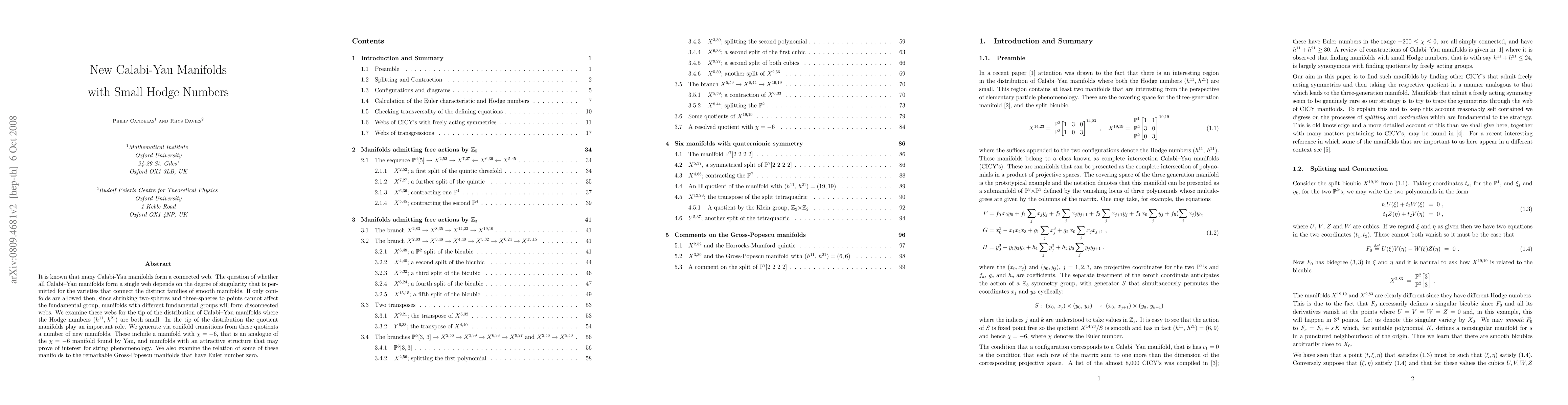 This paper explores new Calabi-Yau manifolds with small Hodge numbers, focusing on the generation of these manifolds via conifold transitions from quotient manifolds. The study reveals manifolds with an Euler characteristic of -6 and structures potentially useful for string phenomenology, alongside their relation to the Euler number zero Gross-Popescu manifolds.