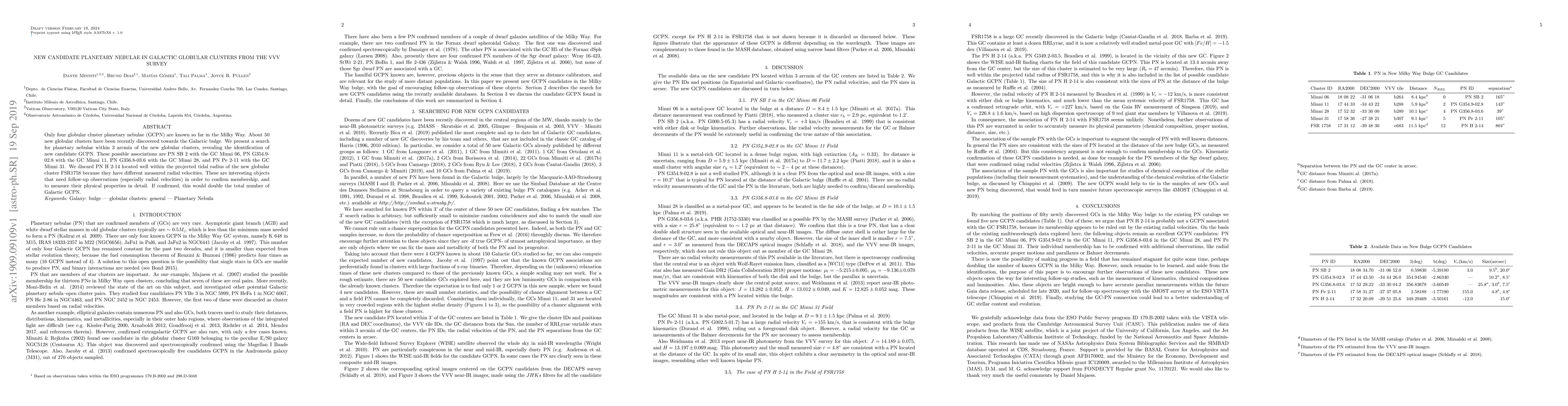 This paper identifies new candidate planetary nebulae associated with recently discovered globular clusters in the Milky Way, including PN SB 2 with Minni 06, PN G354.9-02.8 with Minni 11, PN G356.8-03.6 with Minni 28, and PN Pe 2-11 with Minni 31. Follow-up observations are needed to confirm these associations and measure their physical properties.