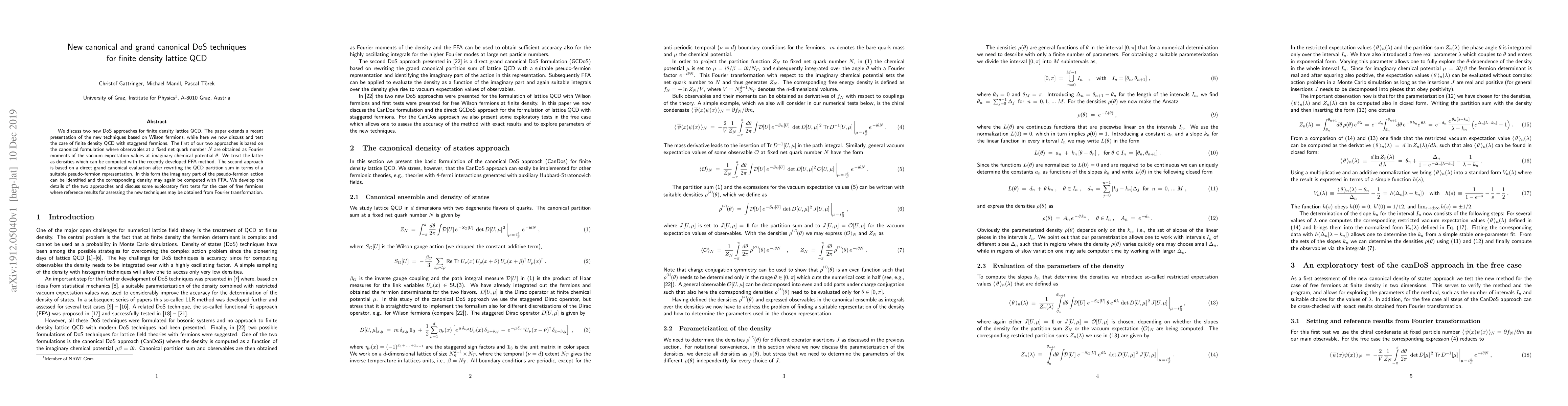 We discuss two new DoS approaches for finite density lattice QCD. The paper extends a recent presentation of the new techniques based on Wilson fermions, while here we now discuss and test the case of finite density QCD with staggered fermions. The first of our two approaches is based on the canonical formulation where observables at a fixed net quark number $N$ are obtained as Fourier moments of the vacuum expectation values at imaginary chemical potential $\theta$. We treat the latter as densities which can be computed with the recently developed FFA method. The second approach is based on a direct grand canonical evaluation after rewriting the QCD partition sum in terms of a suitable pseudo-fermion representation. In this form the imaginary part of the pseudo-fermion action can be identified and the corresponding density may again be computed with FFA. We develop the details of the two approaches and discuss some exploratory first tests for the case of free fermions where reference results for assessing the new techniques may be obtained from Fourier transformation.