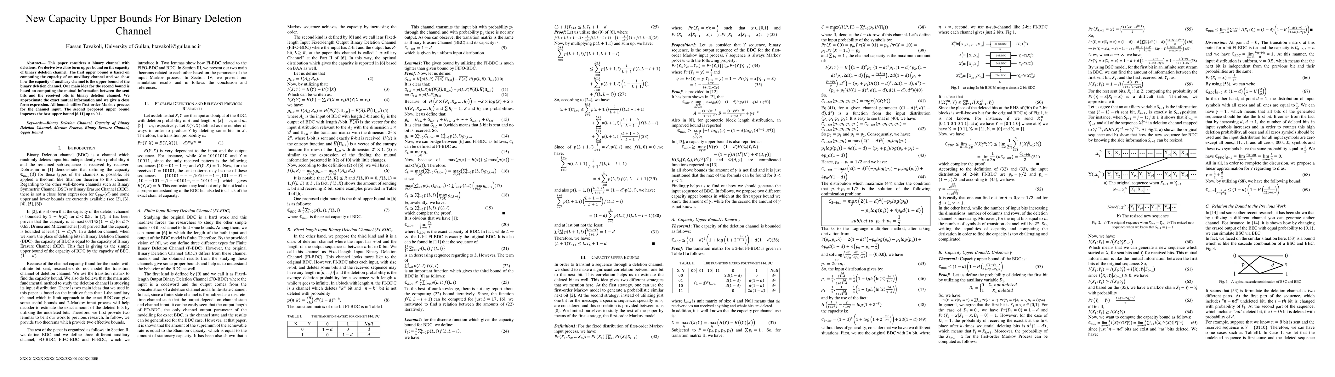 This paper considers a binary channel with deletions. We derive two close form upper bound on the capacity of binary deletion channel. The first upper bound is based on computing the capacity of an auxiliary channel and we show how the capacity of auxiliary channel is the upper bound of the binary deletion channel. Our main idea for the second bound is based on computing the mutual information between the sent bits and the received bits in binary deletion channel. We approximate the exact mutual information and we give a close form expression. All bounds utilize first-order Markov process for the channel input. The second proposed upper bound improves the best upper bound [6,11] up to 0.1.