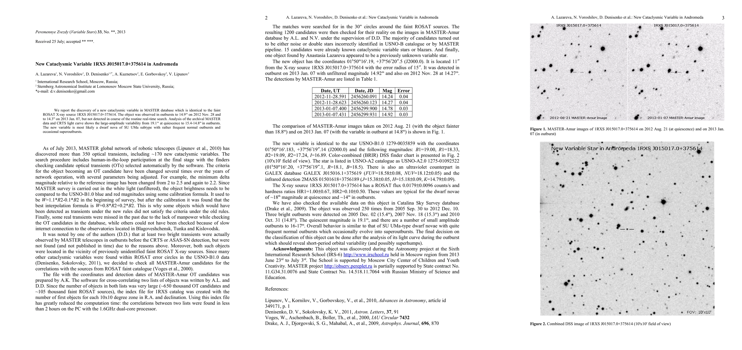 The paper reports the discovery of a new cataclysmic variable, 1RXS J015017.0+375614, identified in the MASTER database and linked to a ROSAT X-ray source. The object exhibited significant variability, with outbursts reaching magnitudes of 14.9m and 14.3m, suggesting it is a dwarf nova of the SU UMa subtype with frequent normal outbursts and occasional superoutbursts.