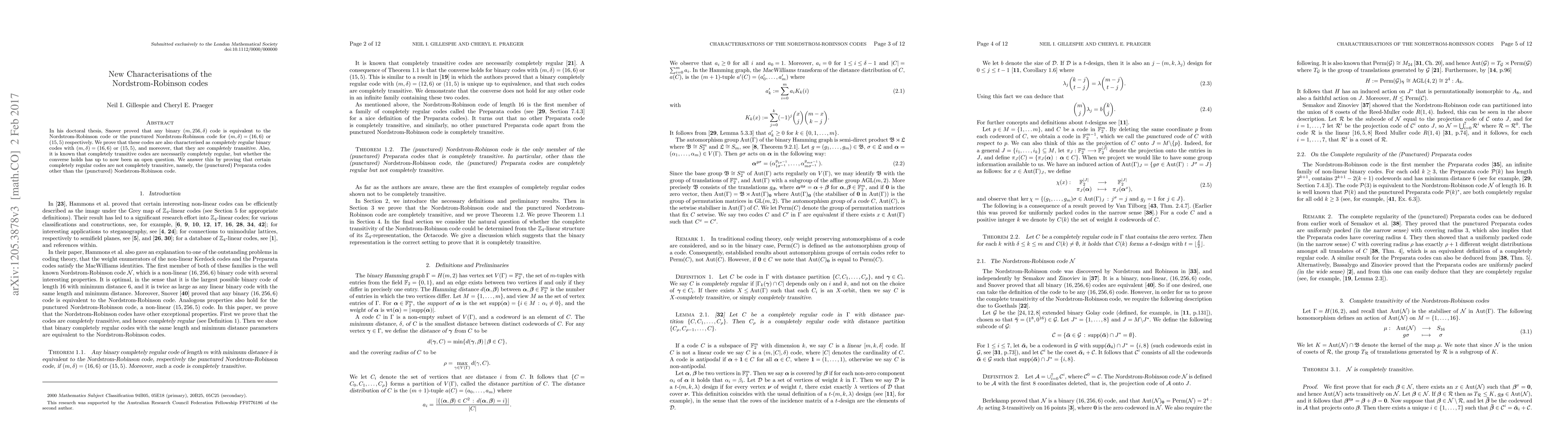 In his doctoral thesis, Snover proved that any binary $(m,256,\delta)$ code is equivalent to the Nordstrom-Robinson code or the punctured Nordstrom-Robinson code for $(m,\delta)=(16,6)$ or $(15,5)$ respectively. We prove that these codes are also characterised as \emph{completely regular} binary codes with $(m,\delta)=(16,6)$ or $(15,5)$, and moreover, that they are \emph{completely transitive}. Also, it is known that completely transitive codes are necessarily completely regular, but whether the converse holds has up to now been an open question. We answer this by proving that certain completely regular codes are not completely transitive, namely, the (Punctured) Preparata codes other than the (Punctured) Nordstrom-Robinson code.