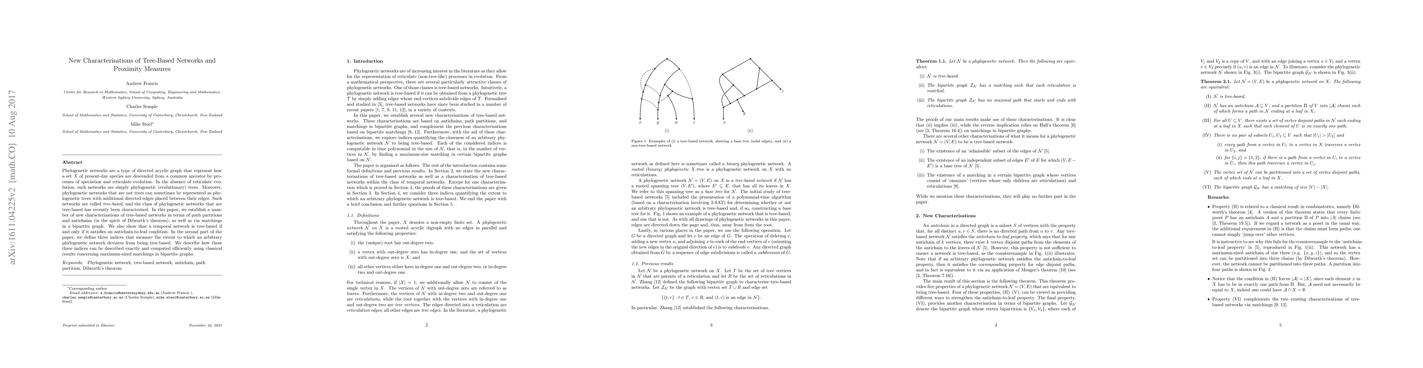Phylogenetic networks are a type of directed acyclic graph that represent how a set $X$ of present-day species are descended from a common ancestor by processes of speciation and reticulate evolution. In the absence of reticulate evolution, such networks are simply phylogenetic (evolutionary) trees. Moreover, phylogenetic networks that are not trees can sometimes be represented as phylogenetic trees with additional directed edges placed between their edges. Such networks are called {\em tree based}, and the class of phylogenetic networks that are tree based has recently been characterised. In this paper, we establish a number of new characterisations of tree-based networks in terms of path partitions and antichains (in the spirit of Dilworth's theorem), as well as via matchings in a bipartite graph. We also show that a temporal network is tree based if and only if it satisfies an antichain-to-leaf condition. In the second part of the paper, we define three indices that measure the extent to which an arbitrary phylogenetic network deviates from being tree based. We describe how these three indices can be described exactly and computed efficiently using classical results concerning maximum-sized matchings in bipartite graphs.