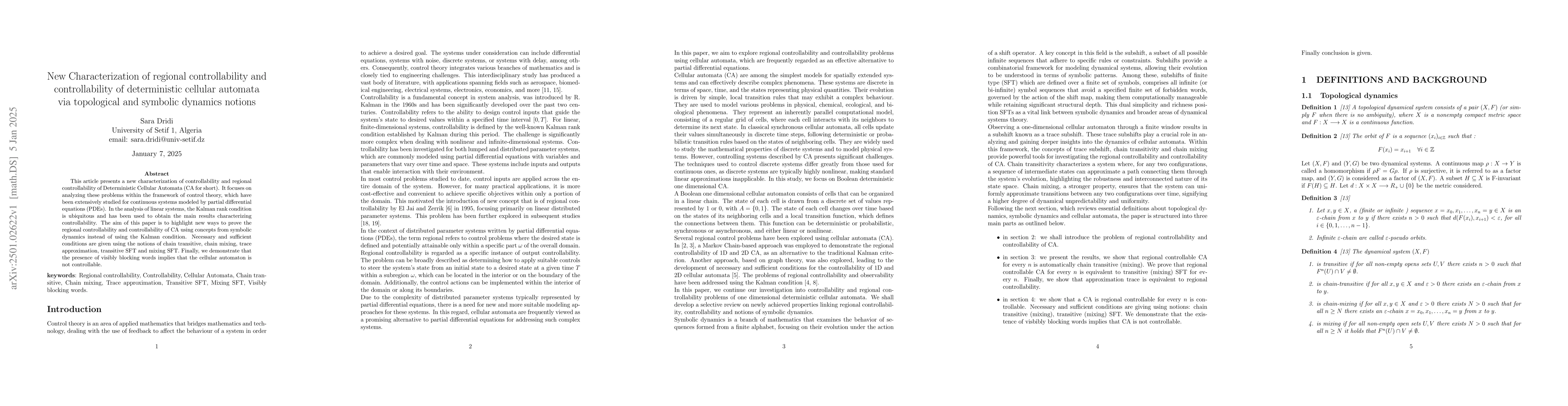 This article presents a new characterization of controllability and regional controllability of Deterministic Cellular Automata (CA for short). It focuses on analyzing these problems within the framework of control theory, which have been extensively studied for continuous systems modeled by partial differential equations (PDEs). In the analysis of linear systems, the Kalman rank condition is ubiquitous and has been used to obtain the main results characterizing controllability. The aim of this paper is to highlight new ways to prove the regional controllability and controllability of CA using concepts from symbolic dynamics instead of using the Kalman condition. Necessary and sufficient conditions are given using the notions of chain transitive, chain mixing, trace approximation, transitive SFT and mixing SFT. Finally, we demonstrate that the presence of visibly blocking words implies that the cellular automaton is not controllable.