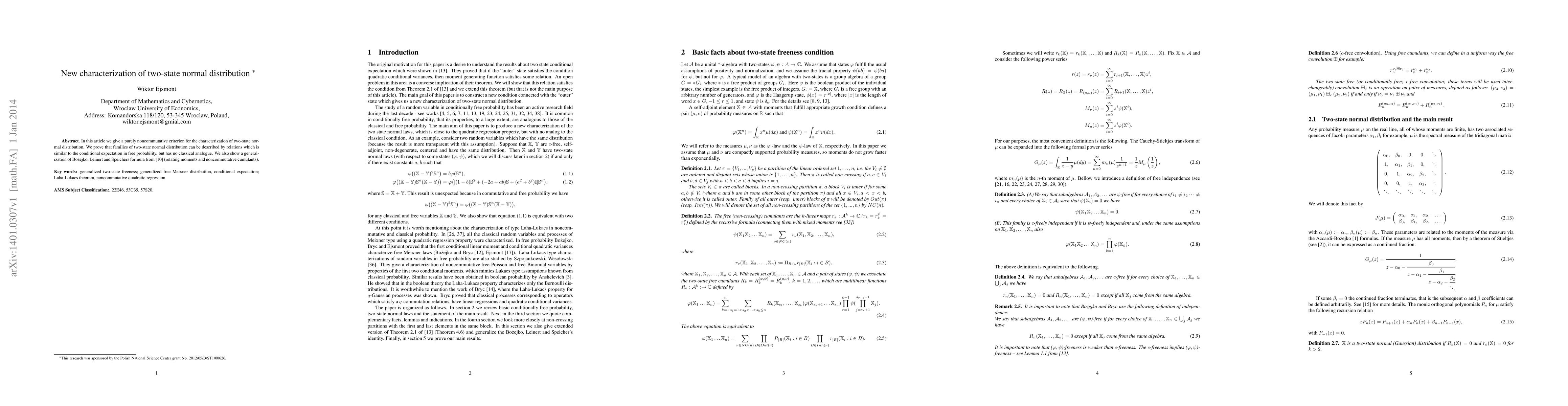 In this article we give a purely noncommutative criterion for the characterization of two-state normal distribution. We prove that families of two-state normal distribution can be described by relations which is similar to the conditional expectation in free probability, but has no classical analogue. We also show a generalization of Bozejko, Leinert and Speicher's formula (relating moments and noncommutative cumulants).
