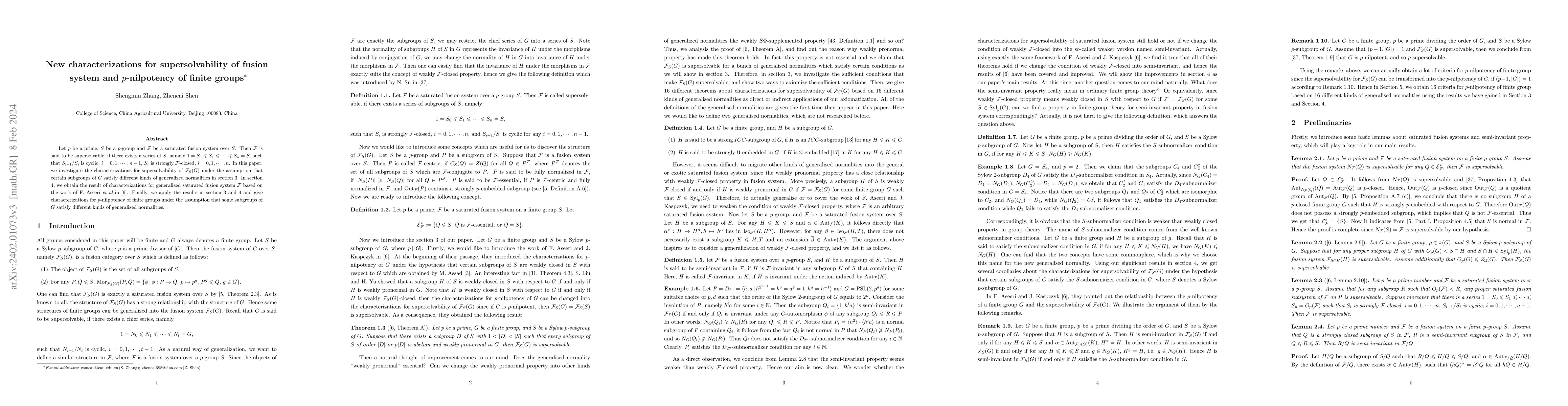 This paper explores new characterizations for the supersolvability of fusion systems over $p$-groups and $p$-nilpotency of finite groups, establishing conditions under which certain subgroups exhibit generalized normality. It provides advanced results for generalized saturated fusion systems and applies these findings to characterize $p$-nilpotency.