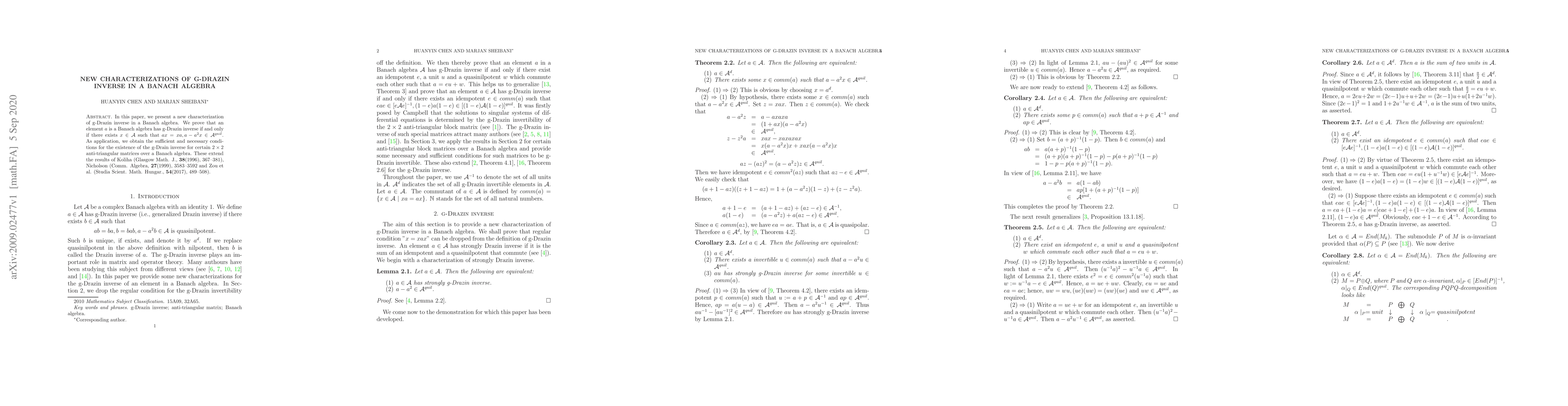 This paper introduces a new characterization of the g-Drazin inverse in Banach algebras, proving that an element has a g-Drazin inverse if there exists an element $x$ satisfying $ax=xa$ and $a-a^2x$ is quasi-nilpotent. It also extends previous results on the existence of g-Drazin inverses for specific $2 \times 2$ anti-triangular matrices.