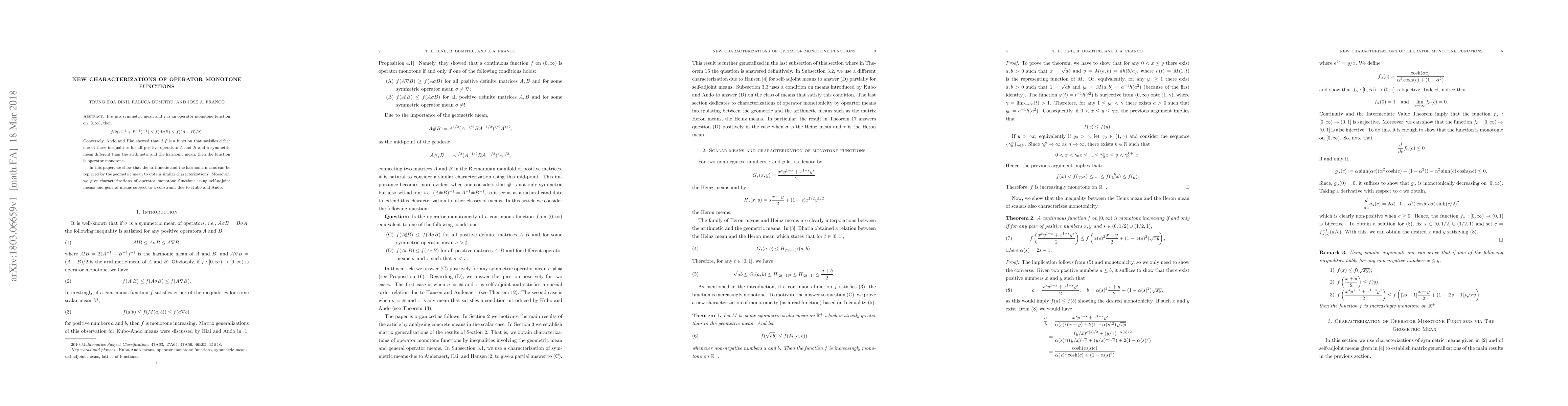 This paper explores new characterizations of operator monotone functions, demonstrating that the geometric mean can replace the arithmetic and harmonic means in existing inequalities. It also provides characterizations using self-adjoint and general means under the Kubo-Ando constraint.