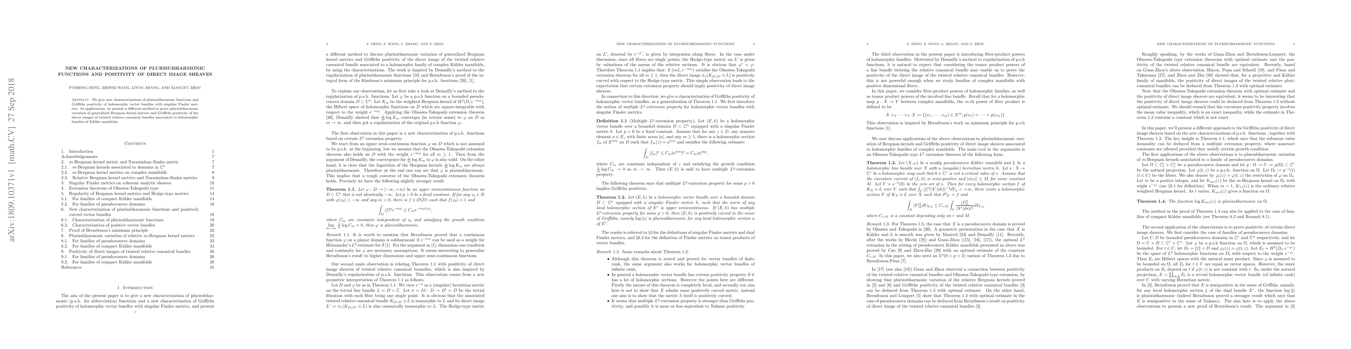 We give new characterizations of plurisubharmonic functions and Griffiths positivity of holomorphic vector bundles with singular Finsler metrics. As applications, we present a different method to prove plurisubharmonic variation of generalized Bergman kernel metrics and Griffiths positivity of the direct images of twisted relative canonical bundles associated to holomorphic families of K\"ahler manifolds.