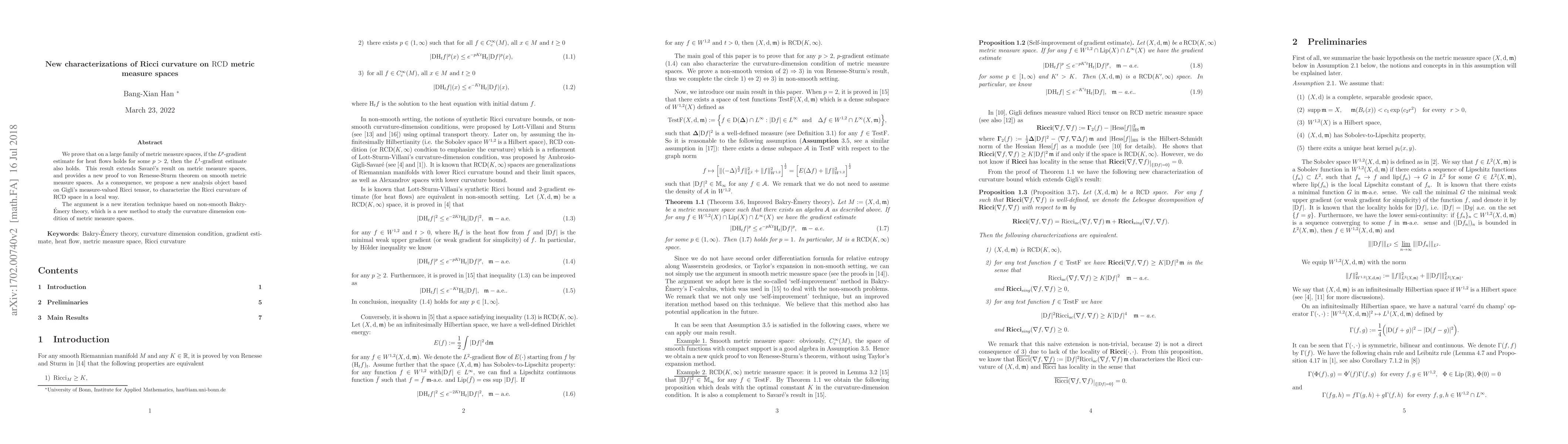We prove that on a large family of metric measure spaces, if the $L^p$-gradient estimate for heat flows holds for some $p>2$, then the $L^1$-gradient estimate also holds. This result extends Savar\'e's result on metric measure spaces, and provides a new proof to von Renesse-Sturm theorem on smooth metric measure spaces. As a consequence, we propose a new analysis object based on Gigli's measure-valued Ricci tensor, to characterize the Ricci curvature of ${\rm RCD}$ space in a local way. The argument is a new iteration technique based on non-smooth Bakry-\'Emery theory, which is a new method to study the curvature dimension condition of metric measure spaces.