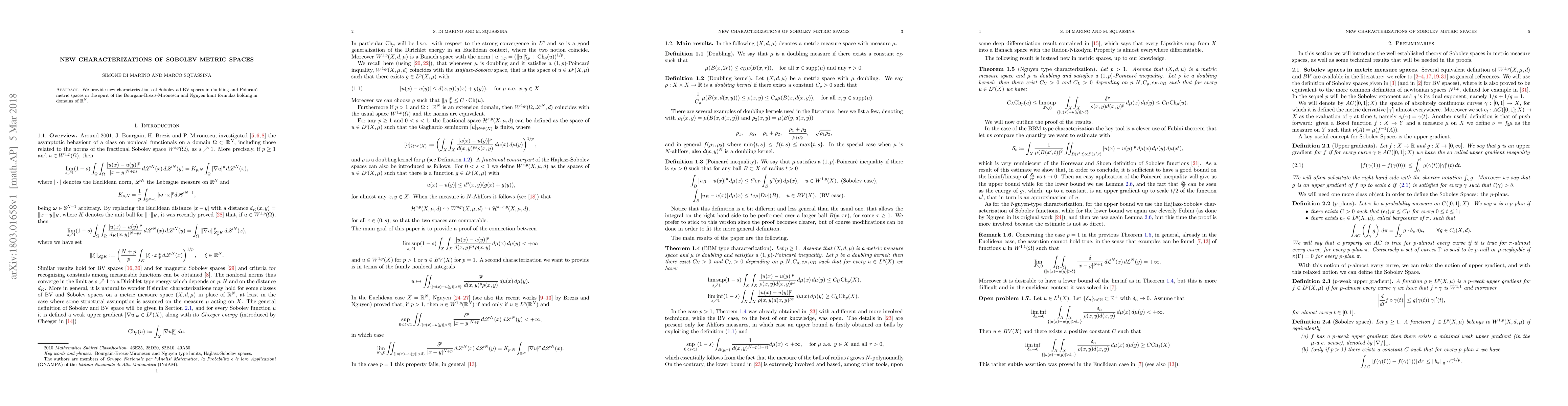 We provide new characterizations of Sobolev ad BV spaces in doubling and Poincare metric spaces in the spirit of the Bourgain-Brezis-Mironescu and Nguyen limit formulas holding in domains of R^N.