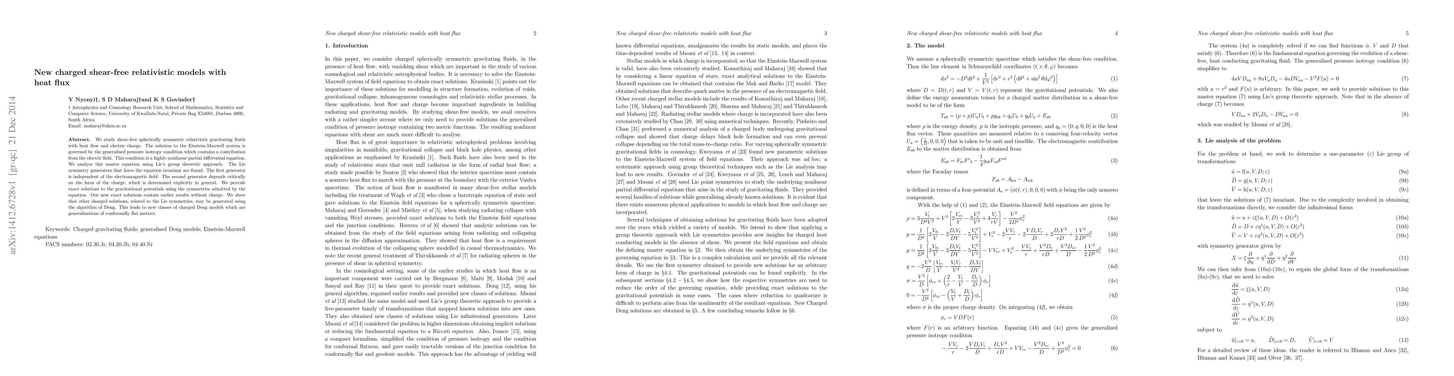 We study shear-free spherically symmetric relativistic gravitating fluids with heat flow and electric charge. The solution to the Einstein-Maxwell system is governed by the generalised pressure isotropy condition which contains a contribution from the electric field. This condition is a highly nonlinear partial differential equation. We analyse this master equation using Lie's group theoretic approach. The Lie symmetry generators that leave the equation invariant are found. The first generator is independent of the electromagnetic field. The second generator depends critically on the form of the charge, which is determined explicitly in general. We provide exact solutions to the gravitational potentials using the symmetries admitted by the equation. Our new exact solutions contain earlier results without charge. We show that other charged solutions, related to the Lie symmetries, may be generated using the algorithm of Deng. This leads to new classes of charged Deng models which are generalisations of conformally flat metrics.