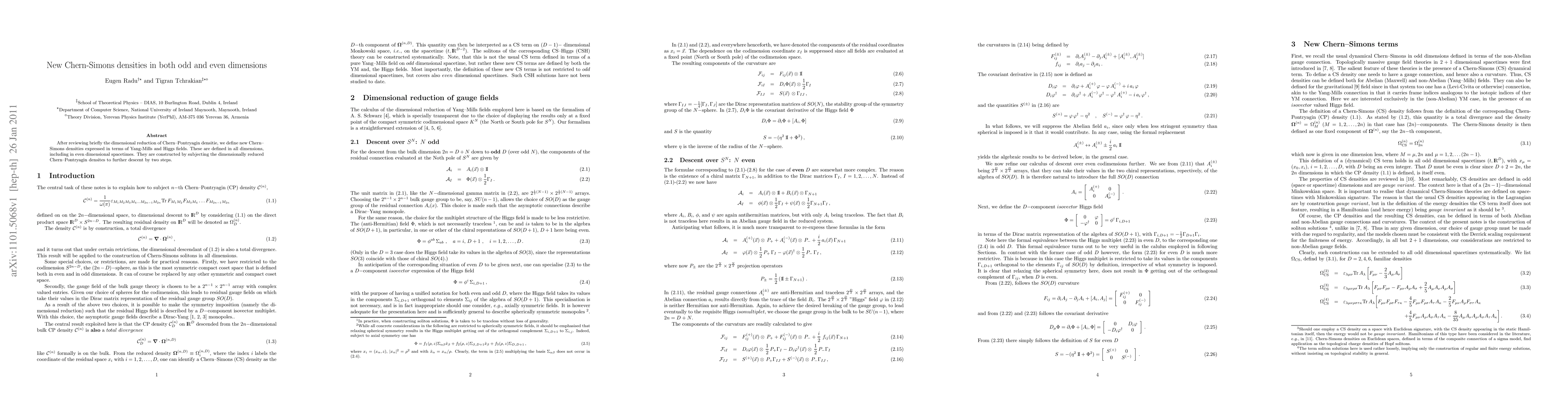 After reviewing briefly the dimensional reduction of Chern--Pontryagin densities, we define new Chern--Simons densities expressed in terms of Yang-Mills and Higgs fields. These are defined in all dimensions, including in even dimensional spacetimes. They are constructed by subjecting the dimensionally reduced Chern--Pontryagin densites to further descent by two steps.