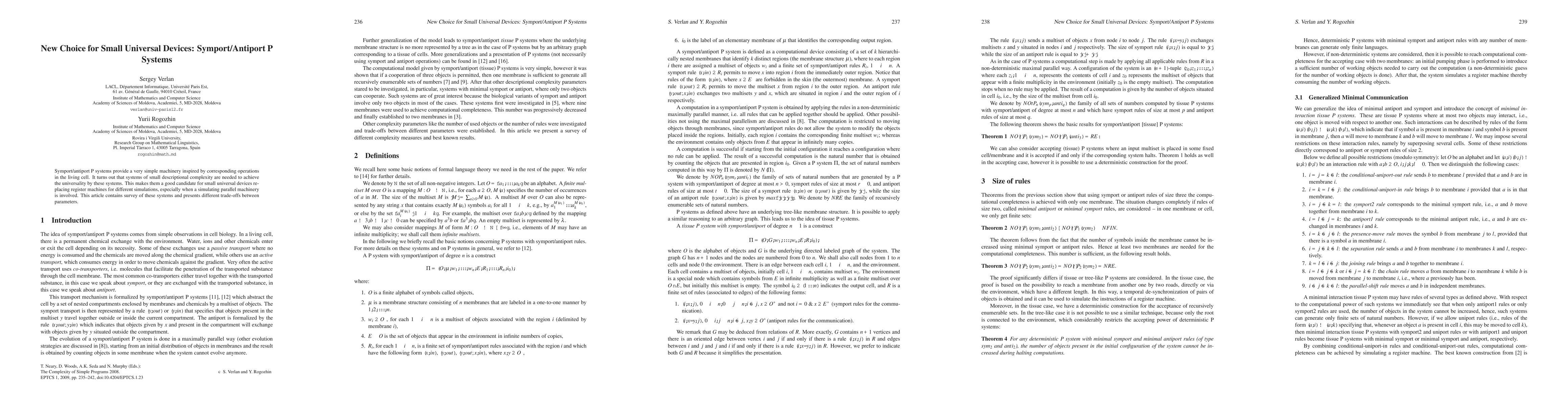 Symport/antiport P systems provide a very simple machinery inspired by corresponding operations in the living cell. It turns out that systems of small descriptional complexity are needed to achieve the universality by these systems. This makes them a good candidate for small universal devices replacing register machines for different simulations, especially when a simulating parallel machinery is involved. This article contains survey of these systems and presents different trade-offs between parameters.