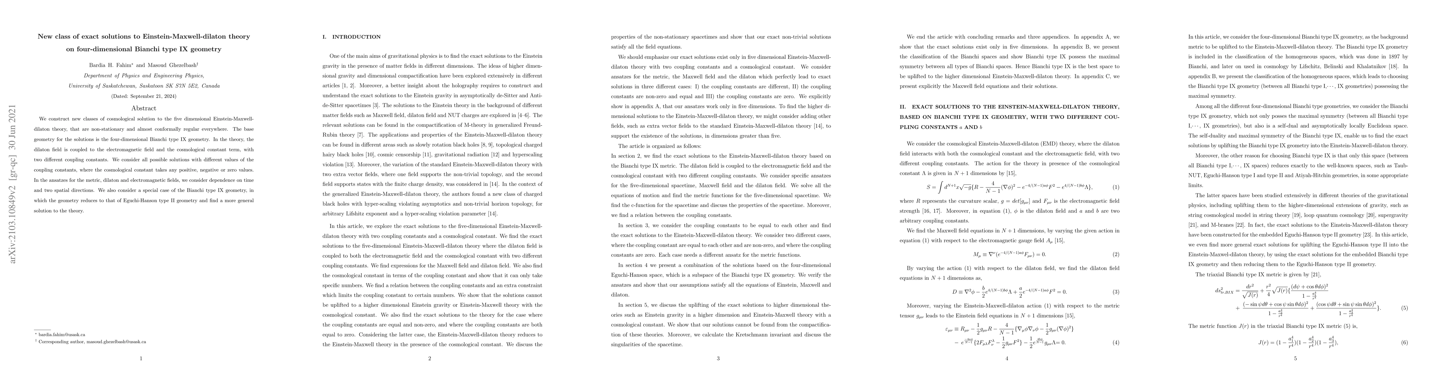 This paper constructs new non-stationary, almost conformally regular cosmological solutions to five-dimensional Einstein-Maxwell-dilaton theory based on four-dimensional Bianchi type IX geometry. The solutions explore various coupling constants for the dilaton field, electromagnetic field, and cosmological constant, and include a special case reducing to Eguchi-Hanson type II geometry.