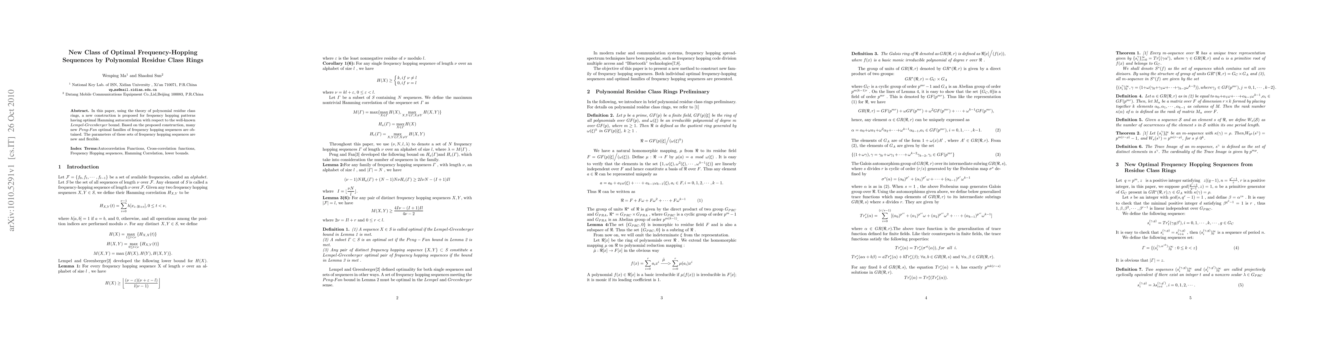 The paper introduces a new method for constructing frequency-hopping sequences using polynomial residue class rings, achieving optimal Hamming autocorrelation up to the Lempel-Greenberger bound, and presenting new flexible parameter sets for Peng-Fan optimal frequency-hopping families.