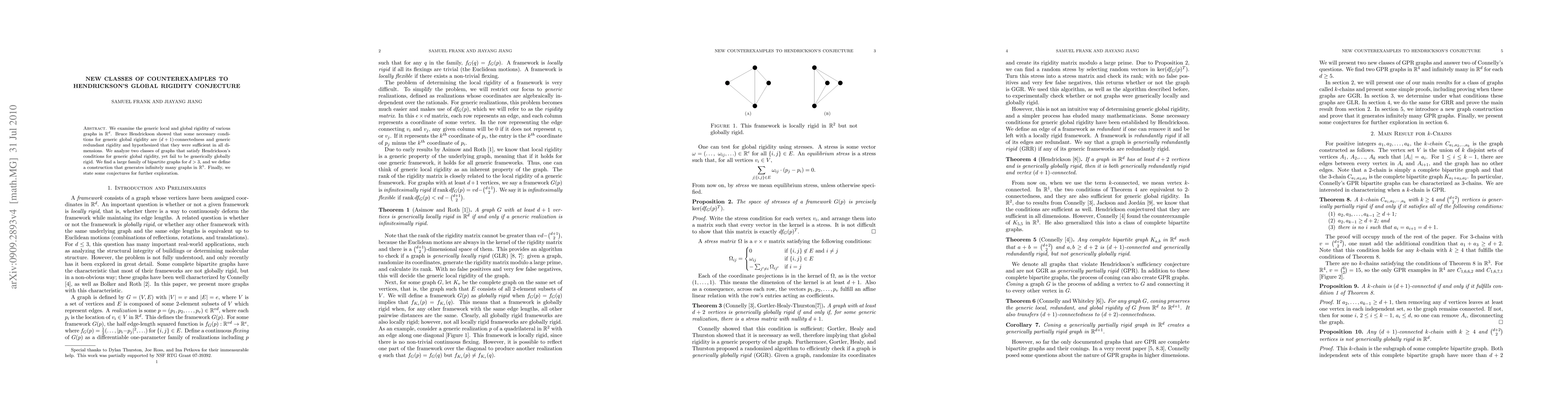 This paper identifies new classes of counterexamples that disprove Hendrickson's conjecture on the sufficiency of (d+1)-connectedness and generic redundant rigidity for global rigidity in graphs. It presents bipartite graphs and a construction method generating infinite counterexamples in R^5, challenging the conjecture's validity.