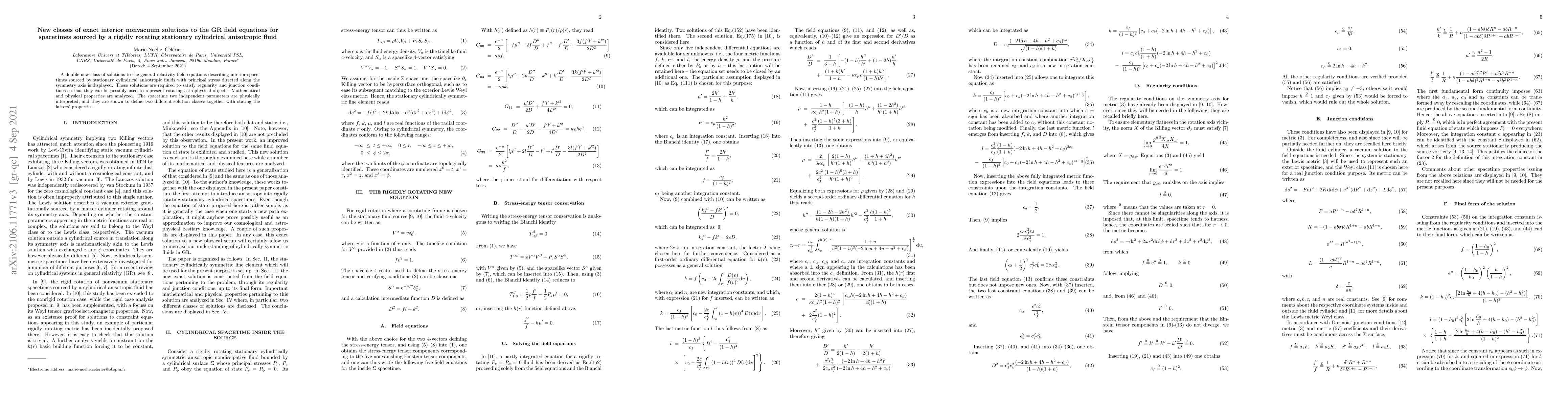 A double new class of solutions to the general relativity field equations describing interior spacetimes sourced by stationary cylindrical anisotropic fluids with principal stress directed along the symmetry axis is displayed. These solutions are required to satisfy regularity and junction conditions so that they can be possibly used to represent rotating astrophysical objects. Mathematical and physical properties are analyzed. The spacetime two independent parameters are physically interpreted, and they are shown to define two different solution classes together with stating the latters' properties.