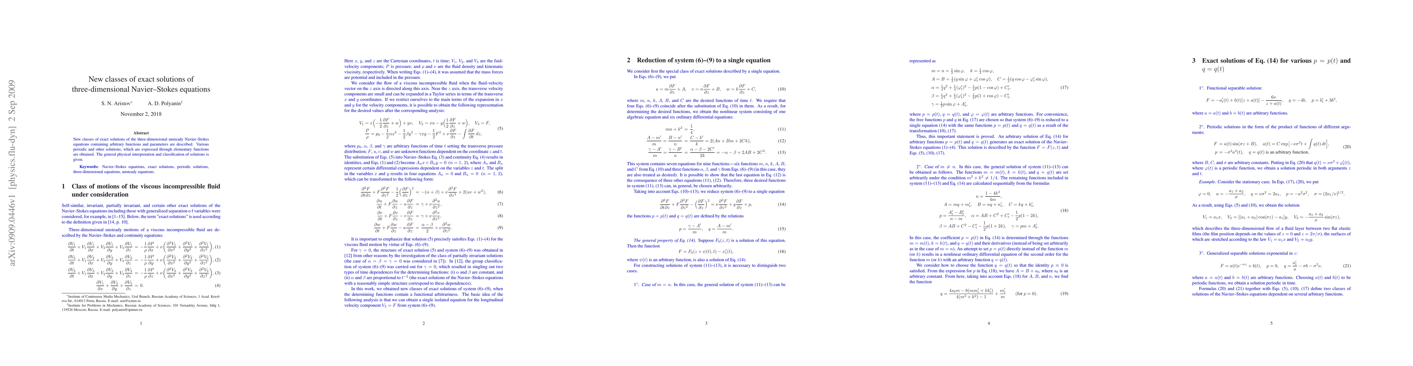 This paper introduces novel classes of exact solutions to the three-dimensional unsteady Navier-Stokes equations, featuring periodic and other solutions expressed via elementary functions. The study provides a general physical interpretation and classification of these solutions.