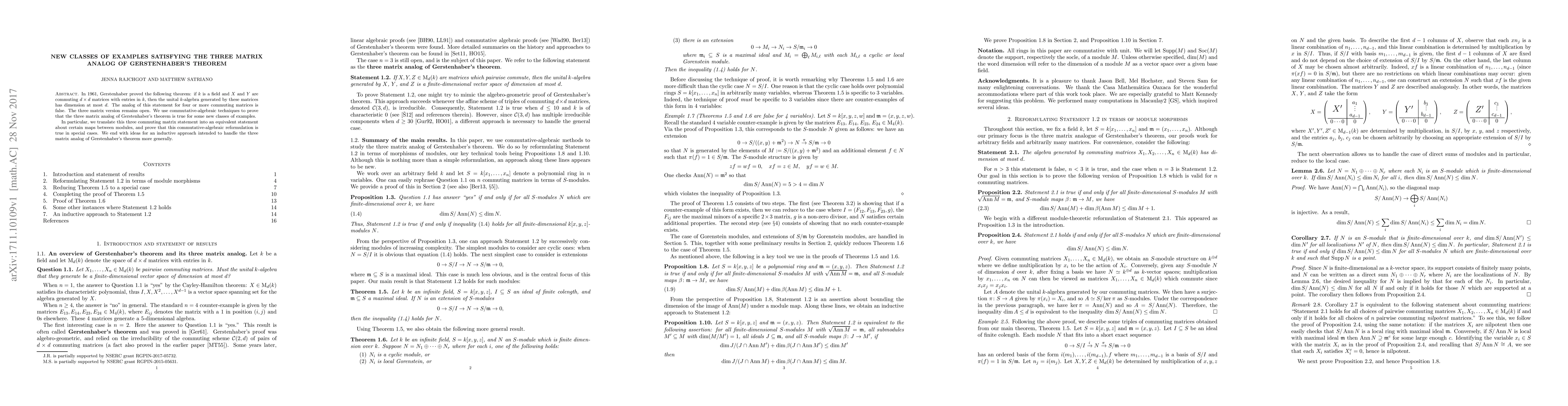 In 1961, Gerstenhaber proved the following theorem: if k is a field and X and Y are commuting dxd matrices with entries in k, then the unital k-algebra generated by these matrices has dimension at most d. The analog of this statement for four or more commuting matrices is false. The three matrix version remains open. We use commutative-algebraic techniques to prove that the three matrix analog of Gerstenhaber's theorem is true for some new classes of examples. In particular, we translate this three commuting matrix statement into an equivalent statement about certain maps between modules, and prove that this commutative-algebraic reformulation is true in special cases. We end with ideas for an inductive approach intended to handle the three matrix analog of Gerstenhaber's theorem more generally.