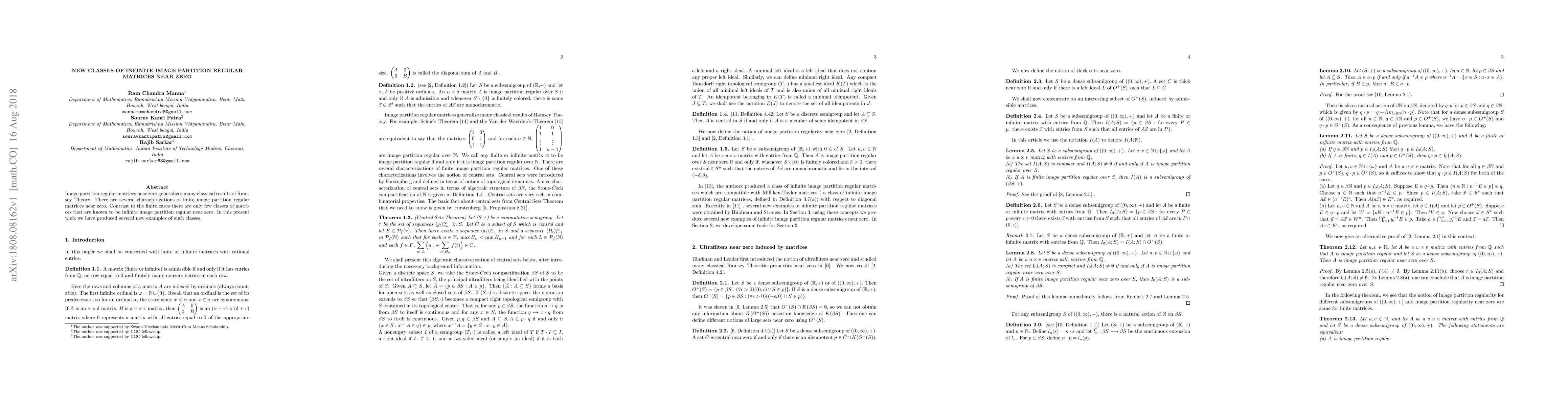 This paper introduces new classes of infinite image partition regular matrices near zero, expanding on the generalizations of classical Ramsey Theory results and providing several novel examples where previously only few classes were known.