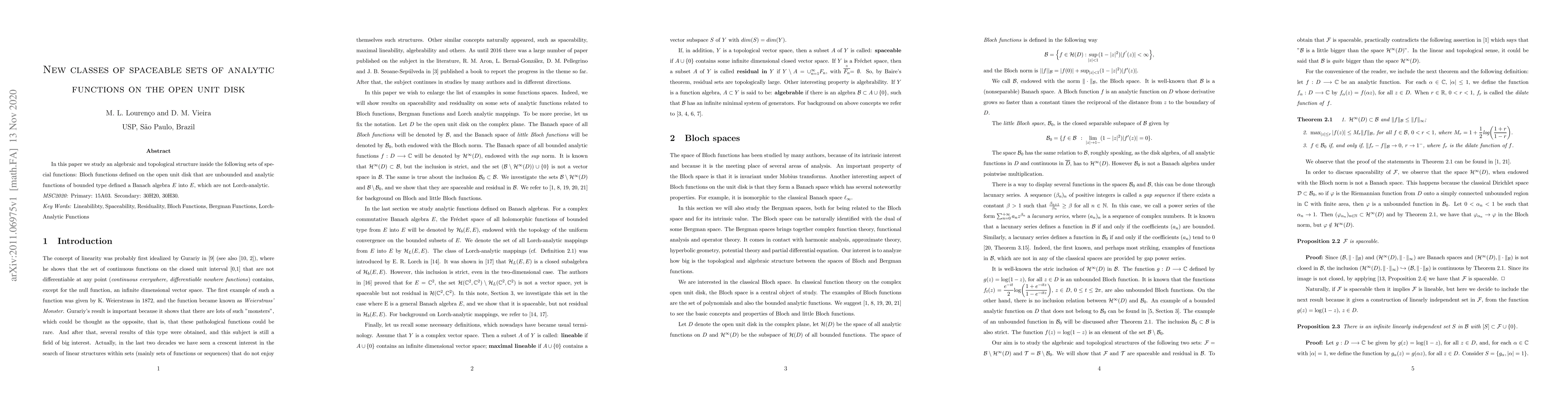 Summary: This paper explores the algebraic and topological properties of spaceable sets within Bloch functions and analytic functions of bounded type, focusing on those that are unbounded and do not conform to Lorch-analyticity within the open unit disk.