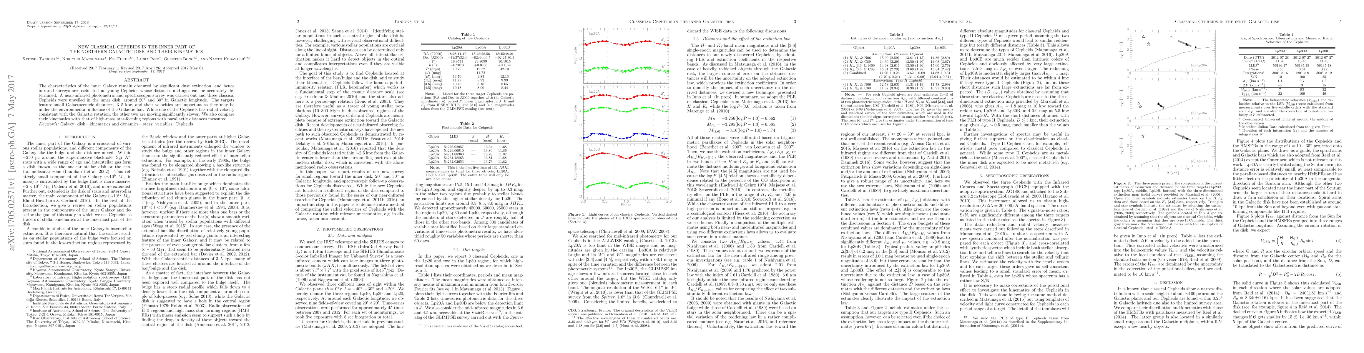 The characteristics of the inner Galaxy remain obscured by significant dust extinction, and hence infrared surveys are useful to find young Cepheids whose distances and ages can be accurately determined. A near-infrared photometric and spectroscopic survey was carried out and three classical Cepheids were unveiled in the inner disk, around 20 and 30 degrees in Galactic longitude. The targets feature small Galactocentric distances, 3-5 kpc, and their velocities are important as they may be under the environmental influence of the Galactic bar. While one of the Cepheids has radial velocity consistent with the Galactic rotation, the other two are moving significantly slower. We also compare their kinematics with that of high-mass star-forming regions with parallactic distances measured.