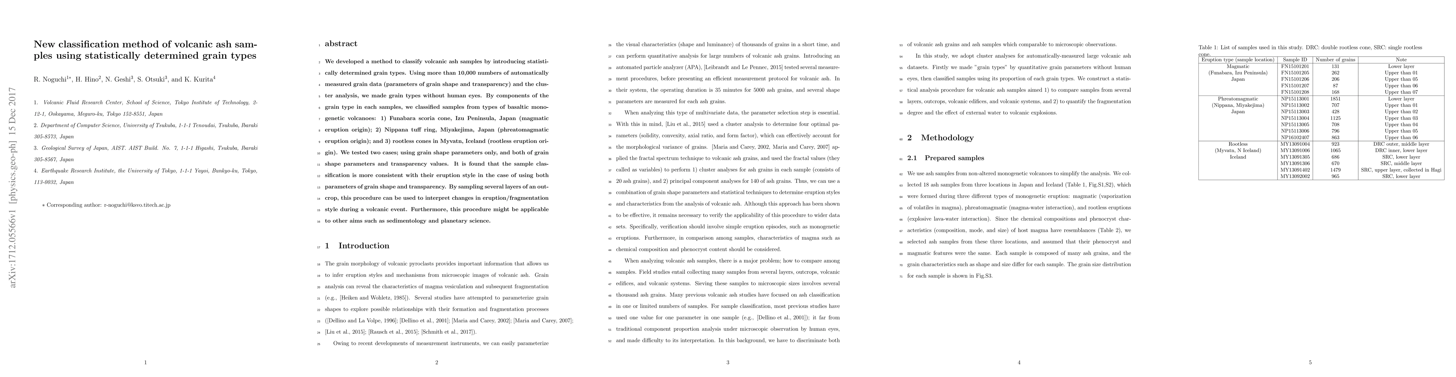 This paper introduces a new classification method for volcanic ash samples based on statistically determined grain types using cluster analysis of over 10,000 automatically measured grain data. The method successfully classifies samples from different volcanic origins, showing better consistency when using both grain shape and transparency parameters.