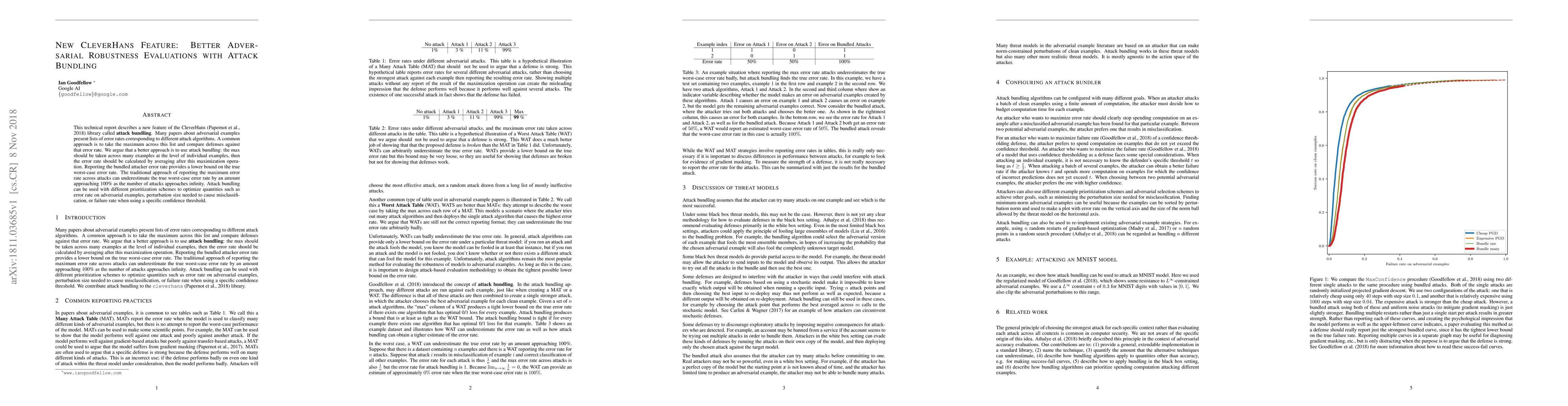 The CleverHans library introduces "attack bundling" to provide a more accurate evaluation of adversarial robustness. Unlike traditional methods that take the maximum error rate across different attack algorithms, attack bundling maximizes across examples first and then averages, offering a lower bound on the true worst-case error rate and improving robustness assessments.