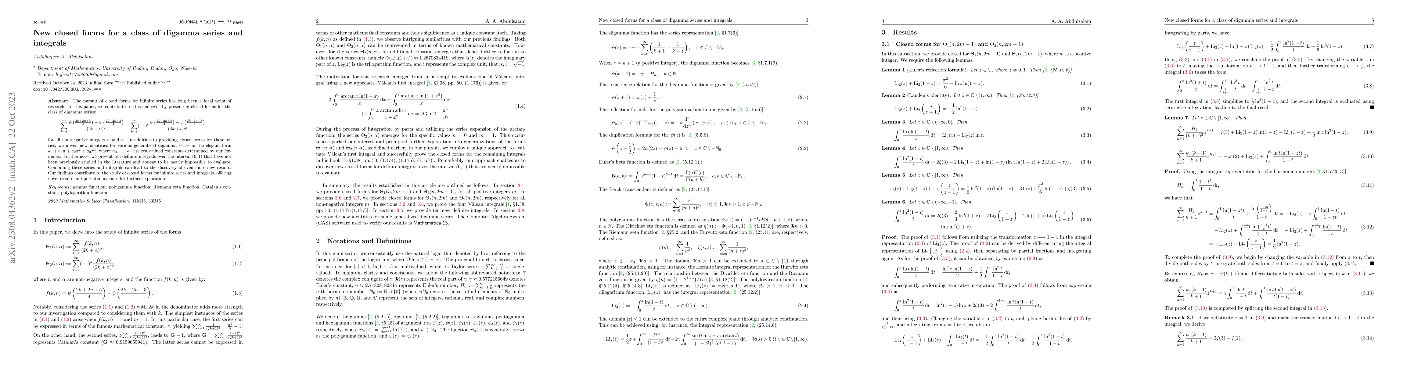 This paper presents closed forms for specific digamma series and unveils new identities for generalized digamma series expressed in the form \(a_0 + a_1 \pi + a_2 \pi^2 + a_3 \pi^3\). Additionally, it introduces ten previously unstudied definite integrals over the interval \((0, 1)\), potentially opening new research directions.