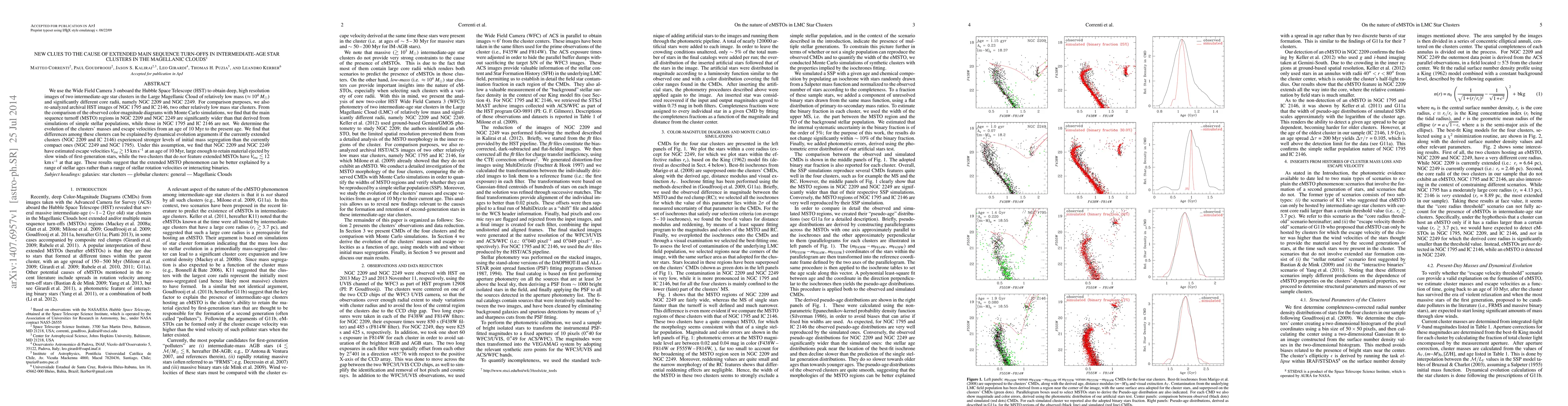 This study uses HST's WFC3 to analyze four intermediate-age star clusters in the Magellanic Clouds, finding that NGC2209 and NGC2249 exhibit extended main sequence turn-offs due to higher initial mass segregation and escape velocities. The results suggest that the phenomenon is linked to stellar ages rather than rotation or binaries.