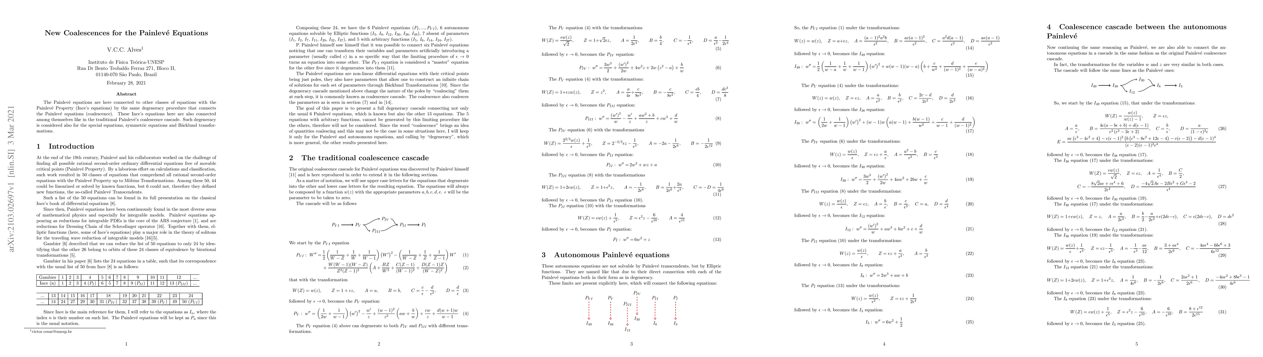 The Painlev\'e equations are here connected to other classes of equations with the Painlev\'e Property (Ince's equations) by the same degeneracy procedure that connects the Painlev\'e equations (coalescence). These Ince's equations here are also connected among themselves like in the traditional Painlev\'e's coalescence cascade. Such degeneracy is considered also for the special equations, symmetric equations and B\"acklund transformations.