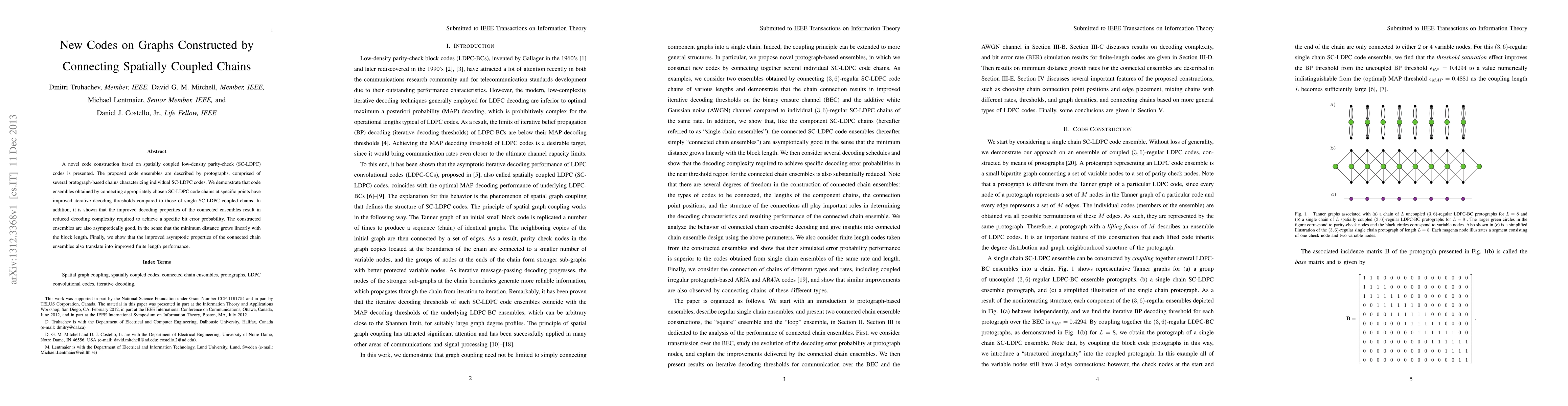 This paper introduces a new code construction based on spatially coupled low-density parity-check (SC-LDPC) codes using protograph-based chains. The connected ensembles of these chains show improved iterative decoding thresholds and reduced decoding complexity compared to single chains, while maintaining asymptotic goodness and enhanced finite length performance.