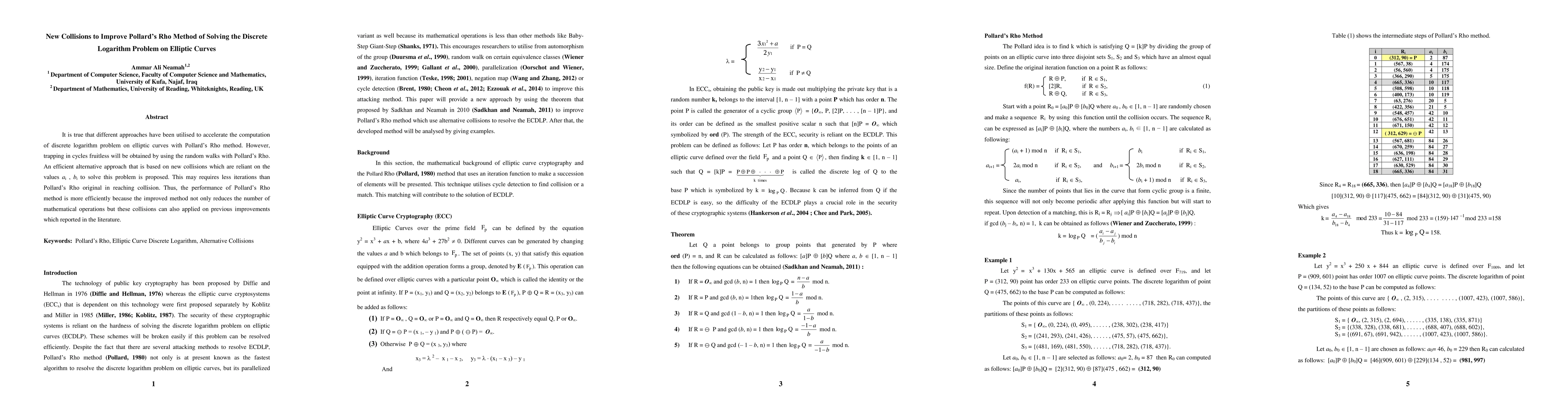 It is true that different approaches have been utilised to accelerate the computation of discrete logarithm problem on elliptic curves with Pollard's Rho method. However, trapping in cycles fruitless will be obtained by using the random walks with Pollard's Rho. An efficient alternative approach that is based on new collisions which are reliant on the values ai , bi to solve this problem is proposed. This may requires less iterations than Pollard's Rho original in reaching collision. Thus, the performance of Pollard's Rho method is more efficiently because the improved method not only reduces the number of mathematical operations but these collisions can also applied on previous improvements which reported in the literature.