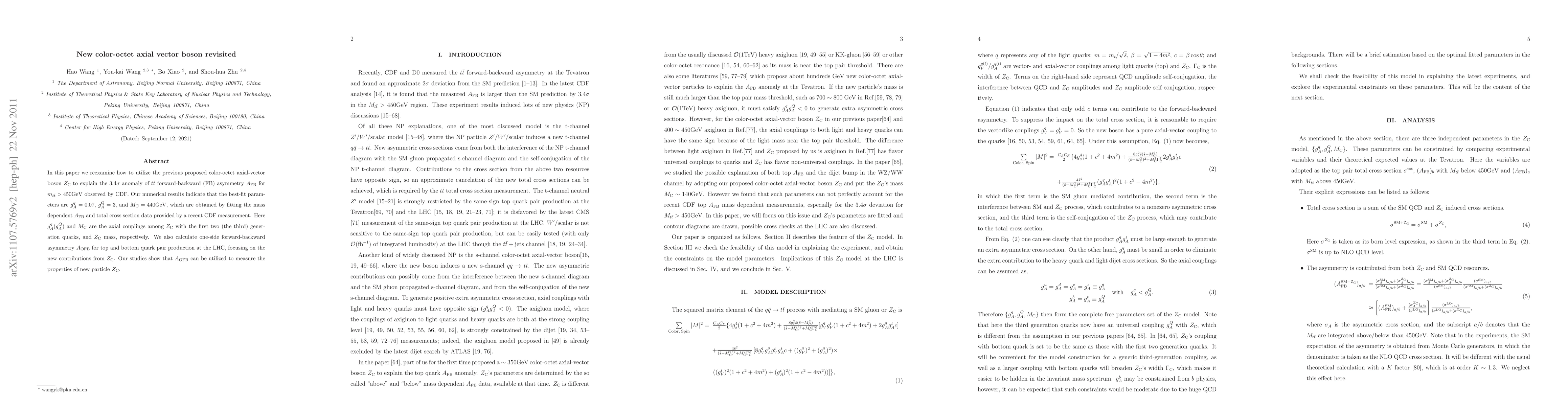 In this paper we re-examine how to utilize the previous proposed color-octet axial-vector boson $Z_{\rm C}$ to explain the $3.4\sigma$ anomaly of $t\bar t$ forward-backward (FB) asymmetry $A_{\rm FB}$ for $m_{t\bar t}> 450$GeV observed by CDF. Our numerical results indicate that the best-fit parameters are $g_A^q=0.07$, $g_A^Q=3$, and $M_{\rm C}=440\text{GeV}$, which are obtained by fitting the mass dependent $A_{\rm FB}$ and total cross section data provided by a recent CDF measurement. Here $g_A^q (g_A^Q)$ and $M_{\rm C}$ are the axial couplings among $Z_{\rm C}$ with the first two (the third) generation quarks, and $Z_{\rm C}$ mass respectively. We also calculate one-side forward-backward asymmetry $A_{\rm OFB}$ for top and bottom quark pair production at the LHC, focusing on the new contributions from $Z_{\rm C}$. Our studies show that $A_{\rm OFB}$ can be utilized to measure the properties of new particle $Z_{\rm C}$.