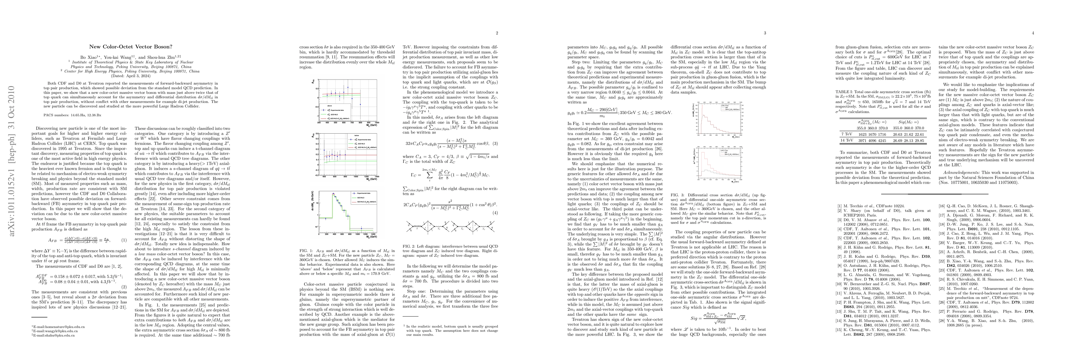 Both CDF and D0 at Tevatron reported the measurements of forward-backward asymmetry in top pair production, which showed possible deviation from the standard model QCD prediction. In this paper, we show that a new color-octet massive vector boson with mass just above twice that of top quark can simultaneously account for the asymmetry and differential distribution $d\sigma/dM_{t\bar t}$ in top pair production, without conflict with other measurements for example di-jet production. The new particle can be discovered and studied at the more powerful Large Hadron Collider.