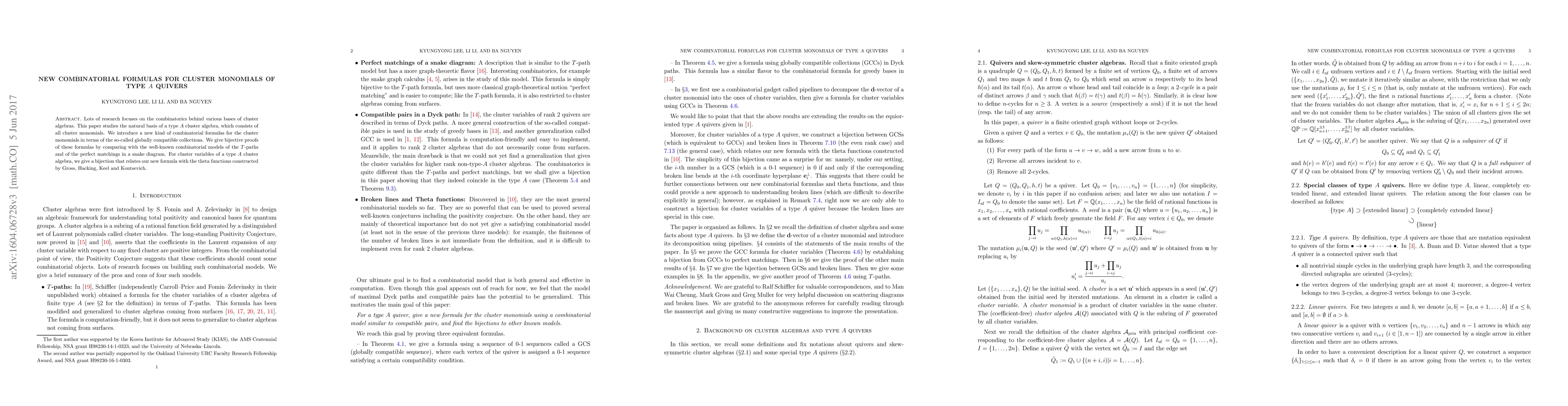 This paper introduces new combinatorial formulas for cluster monomials in type A cluster algebras, expressed via globally compatible collections. It provides bijective proofs by linking these formulas to T-paths and perfect matchings in snake diagrams, and relates them to theta functions from Gross, Hacking, Keel, and Kontsevich.