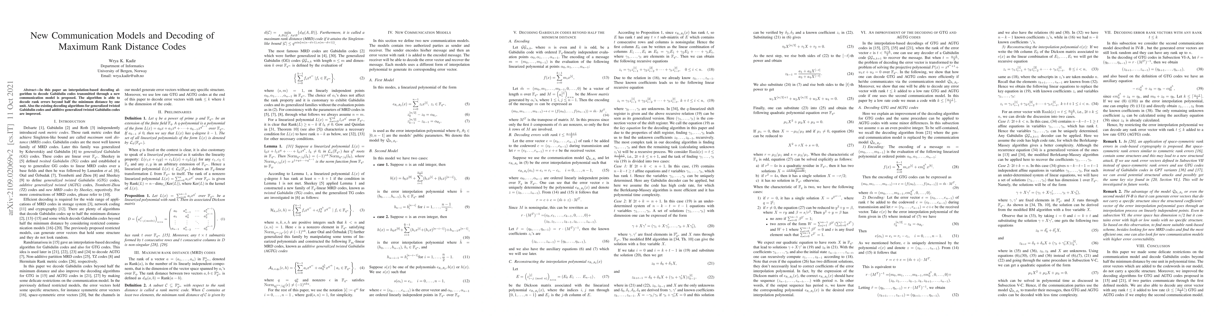 In this paper an interpolation-based decoding algorithm to decode Gabidulin codes, transmitted through a finely restricted channel, is proposed. The algorithm is able to decode rank errors beyond half the minimum distance by one unit. Also the existing decoding algorithms for generalized twisted Gabidulin codes and additive generalized twisted Gabidulin codes are improved.