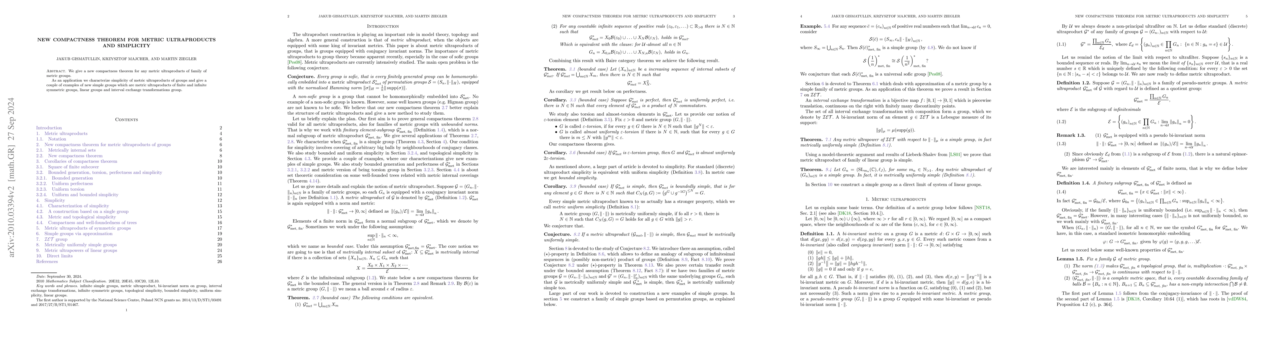 We give a new compactness theorem for any metric ultraproducts of family of metric groups. As an application we characterize simplicity of metric ultraproducts of groups and give a couple of examples of new simple groups which are metric ultraproducts of finite and infinite symmetric groups, linear groups and interval exchange transformations group.